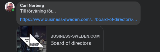 https://www.dagensjuridik.se/nyheter/riksrevisionen-granskar-styrningen-av-business-sweden/?fbclid=IwAR3Mm6Ql0aUotL0MM2NCRFks8rj59NPYTx1wopBSvuPtCtAZfvCHL6dqSEs " Riksrevisionen granskar nu om styrningen av Business Swedenn är effektiv för att uppnå statens mål. – Business Sweden är varken myndighet eller bolag, där ingen av ägarna har ett dominerande inflytande. Det har lett till en komplex styrning med stora utmaningar, säger riksrevisionsdirektör Claudia Gardberg Morner. Business Sweden ägs till hälften av staten och till hälften av näringslivet. Business Sweden har en mycket ovanlig organisationsform och både statliga och privata intäkter, som bland annat riskerar att leda till begränsad insyn och bristande konkurrensneutralitet. Riksrevisionen granskar nu om styrningen av Business Sweden är effektiv för att uppnå statens mål. – Business Sweden är varken myndighet eller bolag, där ingen av ägarna har ett dominerande inflytande. Det har lett till en komplex styrning med stora utmaningar, säger riksrevisionsdirektör Claudia Gardberg Morner. Omsätter cirka 800 miljoner kronor. Business Swedens syfte är att hjälpa svenska företag att öka sin globala försäljning, och internationella företag att investera och expandera i Sverige. Business Sweden omsätter ungefär 800 miljoner kronor och har knappt 500 anställda. Verksamheten har kontor i drygt 40 länder. Business Sweden leds av en styrelse där näringslivet och staten tillsätter lika många ledamöter var. Lite drygt 40 procent av intäkterna kommer från försäljning till privata företag. Insynen är mer begränsad än för en statlig myndighet, trots att organisationen mottar omfattande statliga medel för att utföra statliga uppdrag. Komplex styrning ”Såväl organisationsformen som den statliga styrningen är unika då verksamheten varken är myndighet eller bolag. Den ovanliga verksamhetsformen, kombinationen av privat och offentligt finansierad verksamhet samt två ägare där ingen har det dominerande inflytandet har lett till en komplex styrning”, skriver Riksrevisionen. Organisationen som helhet och styrningen av den har hittills inte utvärderats. Enligt Riksrevisionen ska granskningen svara på om styrningen av Business Sweden är effektiv för att uppnå statens mål med verksamheten."https://www.business-sweden.com/about-us/organisation--governance/board-of-directors/?fbclid=IwAR3Raiq89Nznj_vJ0ZBxk8gVecqGO6MmBJvqrfz1JTHIux0SNfe53InExt4