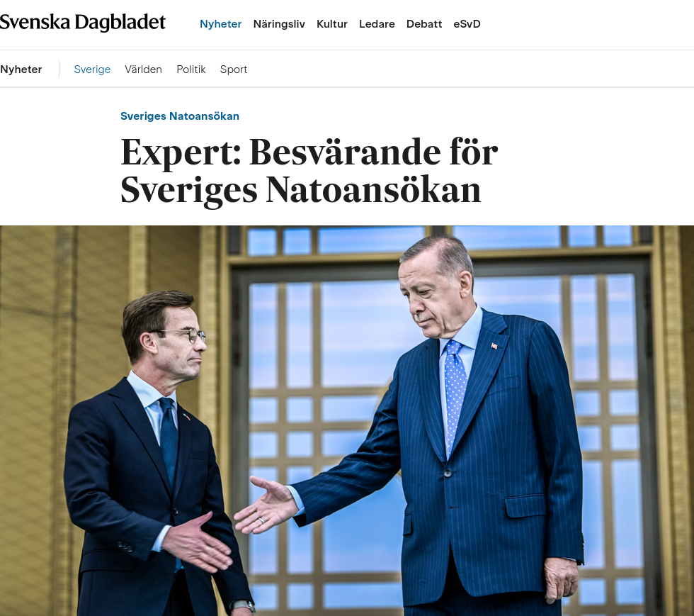 https://www.svd.se/a/l3eEmL/usa-politiker-turkiet-maste-halla-sig-till-avtalet?fbclid=IwAR3WqvhbZFJLre_U_ucUi2UMVCFoyYCwkjUPkFBAvSHuyRQ7D69bakc5pe4 " Mindre än en timme efter att Finlands flagga hissats utanför Natohögkvarteret i Bryssel radade tio amerikanska kongressledamöter, fem republikaner och fem demokrater, upp sig i en trång lokal en halv trappa ned i försvarsdepartementet i Stockholm. Tillsammans med svenska försvarsministern Pål Jonson (M) och civilförsvarsminister Carl-Oskar Bohlin försäkrade de på en pressträff att USA fortsätter stödja att Sverige snarast ska kunna följa Finland in i försvarsalliansen. – En del av vad USA gör är att öppet stödja Sverige, och ett sätt vi gör det på är genom att vara här i dag under en väldigt historisk tidpunkt för oss och uppenbarligen för Sverige, säger republikanen Sam Graves, ledamot i USA:s representanthus. Han tar upp den överenskommelse som Sverige, Finland och Turkiet undertecknade i juli förra året, där Turkiet ställer krav för att godkänna Sverige i Nato. Ungern kommer troligen att godkänna Sverige så snart Turkiet säger att man kommer att ge grönt ljus, tror Sam Graves. – Vi har sett med vilken engagemang Sverige har uppfyllt de skyldigheter som lades fram i samförståndsavtalet. Och Turkiet måste hålla sig till det också och inte ändra sig halvvägs. En av sakerna vi kommer att uppmana Turkiet att göra är att hålla sig till överenskommelsen. Demokraten Rick Larsen, också han i representanthuset, säger att det är väldigt viktigt att också Sverige är medlem i Nato innan toppmötet i Vilnius i juli. – Jag tror att det är ännu viktigare att Turkiet och Ungern agerar före det, för det kommer att visa deras engagemang för alliansen. Rick Larsen säger att Sverige visat starkt engagemang för Nato redan när landet inte är medlem. – Jag ser fram emot den dag Sverige är medlem. Men om Turkiet och Ungern inte agerar före Vilnius sänder det ett starkare budskap till Ryssland än någon annanstans. Och det är inte ett budskap som Turkiet och Ungern borde vilja sända. På en fråga om vad det betyder för Natos öppna dörr-policy, som säger att alla länder som uppfyller Natos krav ska få bli medlemmar, svarar Rick Larsen att alla Natoländer måste diskutera om de fortsätter att stödja alla Natoprinciper. – Det inbegriper öppna dörr-policyn och det gäller för Turkiet och det gäller för Ungern att de fortsätter att lyda under de principerna. Också USA:s president Joe Biden pressade på för att Sverige ska bli fullvärdig medlem. I ett uttalande där han välkomnade Finland som den 31 medlemmen uppmanade han Turkiet och Ungern att ”utan dröjsmål” ratificera Sveriges ansökan. Den brittiske premiärministern Rishi Sunak uppmanar alla Natoländer att godkänna Sverige som medlem, rapporterar El País. Pål Jonson hoppas att Sverige ska vara medlem i Nato innan Vilniusmötet. – Nato befinner sig i ett transformativt läge och då är det naturligtvis viktigt för oss att kunna vara fullvärdiga medlemmar. Pål Jonson säger att Sverige är säkrare än innan landet ansökte om Natomedlemskap, och pekar på säkerhetsförsäkringar från stora Natoländer som USA. – Men det bygger också på ett mycket aktivt militärt övningsmönster som USA men även andra länder bedriver i vårt närområde. Kongressdelagationen och ministrarna diskuterade också det svenska totalförsvaret, som enligt Carl-Oskar Bohlin är något som Sverige kan bidra med i Nato. – Det senaste året har verkligen visat på bred front i Europa betydelsen av att arbeta med resiliens. Både för att kunna hantera angrepp i cyberdomänen, men också för att se på till exempel energifrågan i ett säkerhetspolitiskt perspektiv. Det har blivit smärtsamt tydligt för Europa att detta detta måste göras på ett samlat sätt."https://www.svd.se/a/bge5lq/expert-besvarande-for-sveriges-natoansokan?fbclid=IwAR37MVi6cIwz6OQQ0cCAOxwp5xXuZulUqyG_9ZiUmx-CdCXL8v0S-36Phw0 Domen om att det var fel att neka koranbränningar i Stockholm försvårar Sveriges Natoprocess, säger tidigare Turkietambassadören Michael Sahlin. Men på sikt lär Sverige släppas in. Expert: Besvärande för Sveriges Natoansökan – Det klart att det är något som försvårar den redan svåra Natoanslutningsfrågan, det är så lätt för Turkiet att haka på detta, säger Sahlin som är verksam vid Stockholms internationella fredsforskningsinstitut (Sipri). Även om valkampanjen i Turkiet inför valet den 14 maj domineras av jordbävningskatastrofen i februari så är Sveriges Natoansökan också ett aktuellt ämne. – Jag befarar att det här är något som plockas upp i den turkiska valkampanjen och av Erdogan personligen i fler låsande uttalanden, säger Sahlin. Oppositionen i Turkiet, som enats kring presidentkandidaten Kemal Kilicdaroglu, ogillar också koranbränningar starkt. Även om det skulle bli en regimförändring i landet så är inte förvaltningsrättens besked till fördel för Sverige, fortsätter han. När den högerextreme dansksvenske politikern Rasmus Paludan fick tillstånd att bränna Koranen framför Turkiets ambassad i Stockholm så möttes det av kraftiga reaktioner från Turkiet och muslimska länder. Samtalen med Sverige och Finland om Natointrädet avbröts. – Det väckte ursinniga kommentarer och togs till intäkt för att ställa in processen kring det här trilaterala avtalet. Det blev huvudskälen och inte att Sverige skulle utvisa flera personer, säger Michael Sahlin. President Recep Tayyip Erdogan sade också att så länge Sverige tillåter att Koranen bränns och förstörs så kommer Turkiet inte att säga ja till Sveriges Natoansökan. Samtidigt ser Michael Sahlin inte risken att förvaltningsrättens dom skulle göra att Turkiet helt nekar Sverige Natointräde på sikt. Detta eftersom det finns ett tryck från andra Natoländer för att Sverige ska få gå med. –