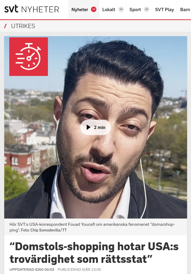 https://www.svt.se/nyheter/utrikes/domstols-shopping-hotar-usa-s-trovardighet-som-rattsstat?fbclid=IwAR3-TAoGb3o0eowsBm0-yBPJrNIwD68TBNAaTtUnmIfYSraD9d4lDz0OIKA "I republikanernas senaste partiprogram står att “det ofödda barnet har en fundamental rätt att leva som inte får inskränkas”. Därför var det lätt att tro att republikanska politiker skulle fira domslutet från distriktsdomstolen i Amarillo, Texas, som i praktiken kan förbjuda förskrivning av abortpillret Mifepriston. Men tvärtom har det varit knäpptyst från de flesta. Abortfrågan är inte den bästa att fokusera på för Republikanerna om de vill vinna val framöver. En majoritet av det amerikanska folket, 65 procent, uppgav i somras att abort borde vara lagligt i de flesta eller alla fall. Och senast häromveckan kom ytterligare ett tecken på vilken vikt abortfrågan kan spela bland väljarna. I Wisconsin vann då den progressiva domaren Janet Protasievicz en plats i delstatens högsta domstol över sin konservativa motståndare Dan Kelly, som fått stöd av många republikaner och antiabortorganisationer. Domstolen förväntas de närmaste åren pröva en viktig abortfråga som blev central i valdebatten. Hon vann valet mot Kelly med elva procentenheter – i en delstat som Joe Biden bara vann mot Donald Trump med en procentenhet. Tagit sikte på domstolarna Men aktivisterna har inte gått och väntat på politiskt momentum. Istället har exempelvis antiabortorganisationerna siktat in sig på domstolarna för att få till förändring. Domaren i fallet om abortpiller heter Matthew Kacsmaryk och blev 2019 en av de ovanligt många domarutnämningar Donald Trump hann med under sina fyra år vid makten. Men distriktet i Texas är speciellt. Den välkänt konservative Matthew Kacsmaryk är den ende domaren där, vilket innebär att alla fall som lämnas in till domstolen hamnar på hans bord. Det visste antiabortorganisationerna – det var därför de valde den domstolen. Ett märkligt kryphål Fenomenet kallas “judge-shopping”, eller domar-shopping, och är ett märkligt kryphål i ett rättsväsende som redan dryper av politisering. De senaste åren har demokrater högljutt klagat på det, efter att exempelvis Texas justitiedepartement sett till att försöka stoppa flera Biden-initiativ den juridiska vägen via sympatiserande domare i Texas. Även andra konservativa grupper har anklagats för domar-shopping. Men demokrater och progressiva grupper är lika goda kålsupare. Flera gånger har sådana grupper valt domstolar med mer progressiva domare, exempelvis i New York eller Washington D.C, när de försökt stoppa initiativ från Trump-administrationen. Eftersom domare på distriktsnivå har möjlighet att ta beslut som påverkar hela landet innebär det en maktställning som till och med ledamöter i USA:s högsta domstol har klagat på. Men det är den amerikanska konstitutionen som slår fast att alla federala domare – inklusive på distriktsnivå – ska nomineras av presidenten och bekräftas av senaten. Domslutet lär överklagas Så, mycket talar för att framtiden bär med sig allt fler politiska fajter – i den juridiska boxningsringen. Om det framöver blir svårare att skilja politik från juridik kommer det i förlängningen också riskera att urholka förtroendet för USA som rättsstat. Kacsmaryks domslut om abortpillret Mifepriston lär nu snabbt överklagas. Då faller avgörandet i hovrätten för femte kretsen, som täcker Texas, Mississippi och Louisiana. Av de 17 nuvarande domarna har tre tillsatts av presidenter som varit demokrater. "