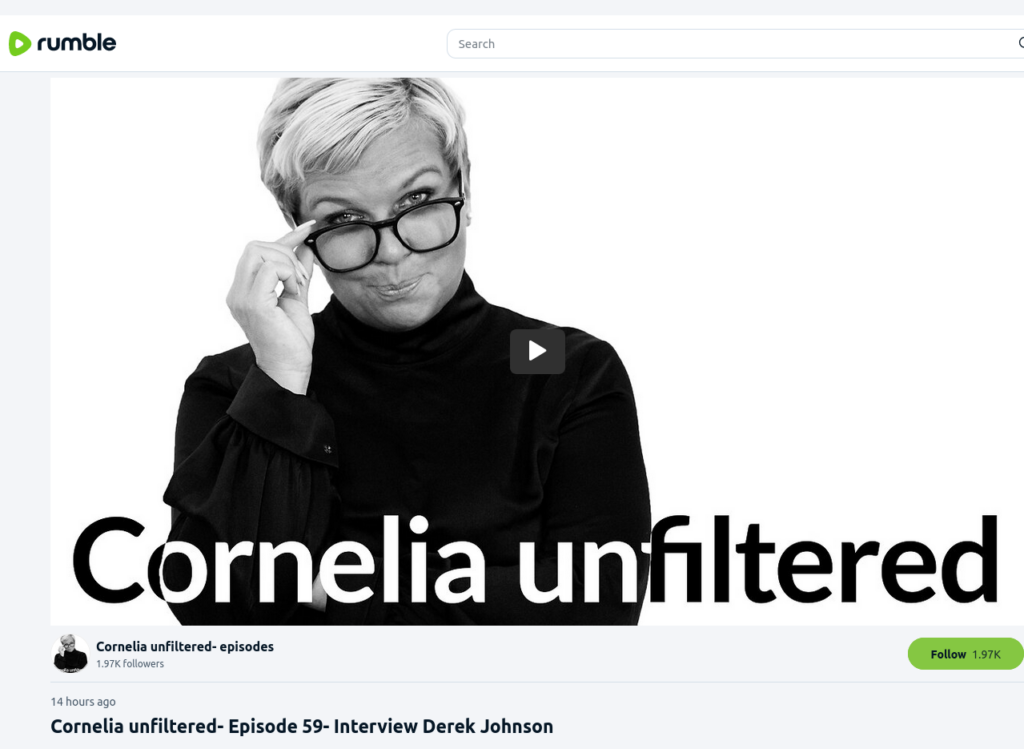 https://rumble.com/v2hfn0u-cornelia-unfiltered-episode-59-interview-derek-johnson.html?fbclid=IwAR0JPSxbg6o0rvJuxG3KTjhQWu3jGAmP2K5jGX333VTzqPHZx4p1J93XOE4