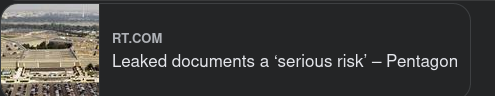 Ja det finns nog några stenar att vända på. --> --> --> https://www.rt.com/news/574503-doj-pentagon-leaks-criminal/?fbclid=IwAR2hvp-HL3DOCQQjDwixXUDWlaIfmvpTeuE4XTOynOb_qiYNUC89unkZSL4 US DOJ inleder Pentagon-läckageundersökning. Washington har eskalerat jakten på den som lagt ut Ukraina-relaterade hemligstämplade dokument. Det amerikanska justitiedepartementet har inlett en brottsutredning om publicering av hemligstämplade dokument relaterade till Ukrainakonflikten, eftersom Vita huset på måndagen föreläste journalister att inte rapportera om deras innehåll. Försvarsdepartementet har skickat över en kriminell remiss till DOJ för att utlösa utredningen, enligt Pentagons pressekreterare Sabrina Singh. Samtidigt har en intern utredning inletts för att "granska och bedöma giltigheten" av dokumenten, som " tycks innehålla känsligt och högst sekretessbelagt material." Fotografier av skannade informationsbilder publicerades först på en meddelandeplattform som heter Discord i januari, men gick obemärkt förrän förra veckan. Sedan dess har fler dokument dykt upp på Twitter och Telegram också, med den senaste batchen som dyker upp på fredag. Enligt Financial Times har deras frigivning "sått kaos och paranoia bland Washingtons nationella säkerhetsapparat inför ett kritiskt ögonblick" i Ukrainakonflikten, precis som Kiev är på väg att inleda en mycket efterlängtad "motoffensiv". Pentagons talesman Chris Meagher sa till reportrar på måndagen att han inte kunde bekräfta dokumentens äkthet, men att de " tycks visa dokument liknande i format de som används för att ge dagliga uppdateringar till våra höga ledare om Ukraina och Ryssland-relaterade operationer, också som andra underrättelseuppdateringar", samtidigt som de insisterar på att vissa "tycks ha ändrats." Nationella säkerhetsrådets talesman John Kirby sa till reportrar i Vita huset att han inte kunde bekräfta dokumentens giltighet, men att de inte borde rapportera om dem. "Det här är information som inte har någon verksamhet i det offentliga området," sa Kirby . "Det har ingen betydelse, om du inte har något emot att jag säger det, på tidningarnas förstasidor eller på tv. Den är inte avsedd för offentlig konsumtion och den borde inte finnas där ute.” Det har inte hindrat amerikanska medier från att citera anonyma källor inifrån Pentagon för att beskriva jakten på läckaren och tillslaget mot flödet av underrättelser inom den amerikanska militären. Under helgen rapporterade Washington Post "en hög nivå av panik" vid Pentagon, medan Reuters citerade spekulationer om den möjliga källan, allt från en missnöjd anställd till ett "insiderhot". Både Ukraina och Ryssland har dock tonat ner dokumentens betydelse. Kreml sa att Moskva länge hade känt till Washingtons direkta inblandning i konflikten, medan militäranalytiker spekulerade i att läckorna kan vara amerikansk desinformation. Rådgivare till den ukrainska presidenten Vladimir Zelensky hävdade också initialt att dokumenten var desinformation och skyllde på Ryssland. På måndagen ändrade Kiev dock redan några av sina militära planer som svar, enligt CNN – samtidigt som man insisterade på att det faktiska datumet för "motoffensiven" var irrelevant eftersom den redan var igång.https://www.rt.com/news/574500-pentagon-leaked-documents-ukraine/?fbclid=IwAR0HsrOHgoRLjH5B71gHpPfmTj4zOt1ymVY2rl0m7B_BbIkJK1VVEPNjZaw Läckta dokumenterar en "allvarlig risk" – Pentagon. Den amerikanska militären har medgett att några av bilderna var "liknande i format" som hemligstämplade rapporter. I den första officiella kommentaren till onlinepubliceringen av hemligstämplade militära underrättelsedokument sa en talesman för det amerikanska försvarsdepartementet på måndagen att detta representerade en " mycket allvarlig risk" för Washington. Dokumenten utgör "en mycket allvarlig risk för nationell säkerhet och har potential att sprida desinformation", sa Chris Meagher till reportrar. Ett team från Pentagon arbetar med att bedöma om dokumenten är äkta, men bilderna som cirkulerar på olika sociala medieplattformar " tycks visa dokument liknande i format de som används för att ge dagliga uppdateringar till våra högre ledare om Ukraina och Ryssland-relaterade operationer, som såväl som andra underrättelseuppdateringar", tillade Meagher, samtidigt som han insisterade på att vissa "tycks ha ändrats." Medan de första avslöjandena gällde Ukraina-konflikten, innehöll den senaste uppsättningen av filer som dök upp på fredagen information om Kina, Sydkorea, " Indo-Stillahavsområdets militärteater" , Mellanöstern, terrorismbekämpningsoperationer och Israel. "Vi undersöker fortfarande hur detta hände, såväl som omfattningen av problemet," sa Meagher och tillade att " det har funnits steg för att ta en närmare titt på hur den här typen av information distribueras och till vem." Tillslaget har begränsat flödet av underrättelser vid Pentagon och indikerar "en hög nivå av panik" hos militären, rapporterade Washington Post under helgen, med hänvisning till anonyma källor inom DoD. En tjänsteman sa till Reuters att det fanns fyra eller fem teorier om vem som kunde ha varit en källa, allt från en " missnöjd anställd till ett insiderhot." Både Ryssland och Ukraina har borstat bort dokumentens betydelse. Enligt Kreml har Moskva länge känt till Washingtons direkta inblandning i konflikten. Samtidigt spekulerade ryska militäranalytiker att informationen i Pentagon-genomgången kan ha förfalskats för att vilseleda Ryssland om den kommande ukrainska " vårens motoffensiv". Ukrainas president Vladimir Zelenskys rådgivare, Mikhail Podoliak, hade till en början avfärdat dokumenten som falska och anklagat Ryssland för att sprida desinformation. På söndagen rapporterade CNN dock att Kiev redan hade ändrat några av sina militära planer som svar på avslöjandena. Aleksey Danilov, sek