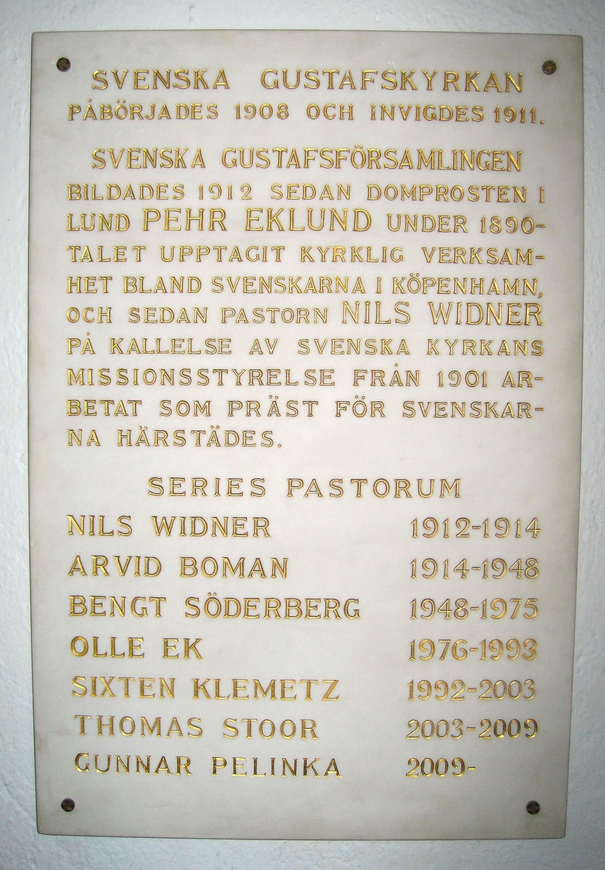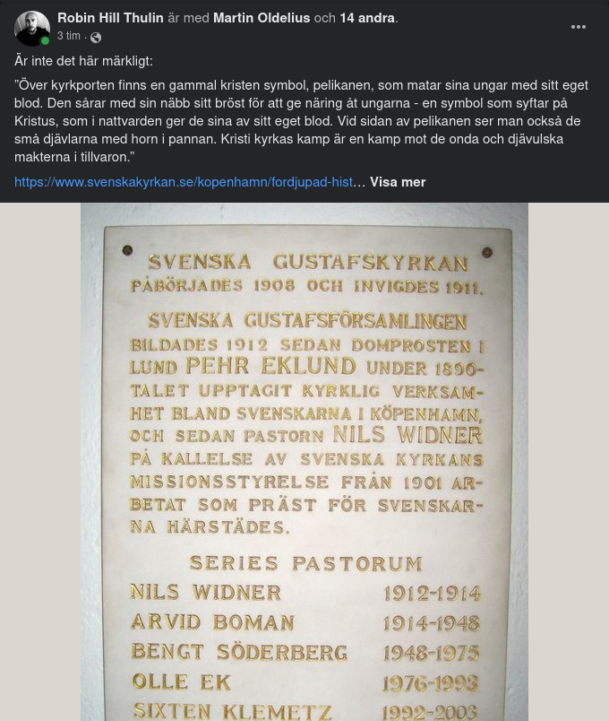 Är inte det här märkligt: ”Över kyrkporten finns en gammal kristen symbol, pelikanen, som matar sina ungar med sitt eget blod. Den sårar med sin näbb sitt bröst för att ge näring åt ungarna - en symbol som syftar på Kristus, som i nattvarden ger de sina av sitt eget blod. Vid sidan av pelikanen ser man också de små djävlarna med horn i pannan. Kristi kyrkas kamp är en kamp mot de onda och djävulska makterna i tillvaron.” https://www.svenskakyrkan.se/kopenhamn/fordjupad-historia "Svenska Kyrkans verksamhet i Köpenhamn började 1901. Missionsstyrelsen sände då pastor Nils Widner hit för att primärt arbeta bland svenskt sjöfolk. På kyrkbåten Bethelskibet, förtöjd i Nyhavnsbassängen, hölls de första sammankomsterna. Kyrkans verksamhet kom emellertid snart att rikta sig till de många tusen svenskar som fanns i Köpenhamn med omnejd. Gudstjänster förrättades vanligen i Garnisonskirken vid Sankt Annae Plads, den första hölls fastlagssöndagen 1901. I sedermera förhyrda lokaler på Rysenstensgade 1 höll man dagliga sammankomster och möten i de olika föreningar som efter hand bildades, ungdomsförening, sångkör, söndagsskola, hjälpförening, föreläsningsförening m. fl. Där bildades också den 28 januari 1903 “Svenska Kyrkoföreningen” - ett beslut av historisk betydelse för den framtida kyrkliga, sociala och kulturella verksamheten. Kyrkoföreningen såg som sin uppgift att förverkliga byggandet av en svensk kyrka i Köpenhamn med egna samlingslokaler. Insamlingar startades och förhandlingar upptogs efter något år med danska myndigheter om lämplig tomt och byggnadstillstånd. Folketinget beviljade i mars 1907 tomt för kyrkbygget på Kastellets mark vid Søndre Frihavnsvej, nuvarande Folke Bernadottes Allé. Arkitekt Gustaf Wickman, Stockholm, fick uppdraget att rita kyrkan. Det övergick emellertid till domkyrkoarkitekten Theodor Wåhlin, Lund, som tecknade Svenska Gustafskyrkan i tidstypisk Jugendstil som vi idag ser henne med kyrkorum, samlingslokaler, kontor, prästgård och personalbostäder, arkiv och förrådsutrymmen. Den 4 juni 1908 lades grundstenen till kyrkan i närvaro av de svenska och danska kungaparen, Gustaf V och Drottning Victoria, Frederik VIII och Dronning Louise. Tre år senare, den 1 juni 1911, invigdes Svenska Gustafskyrkan i Köpenhamn av biskop Gottfrid Billing, Lund. Även då hedrades svenskarna i Köpenhamn med de båda kungaparens närvaro. Namnet Gustafskyrkan hänför sig till vår dåvarande kung Gustaf V. Kyrkobyggnaden. När man går in genom portalen med de tre svenska kronorna, ser man på terrassens fondvägg skulptören Henrik Starckes relief “Herren besöker Abraham i Mamre Lund”, en gåva till Gustafskyrkan av Prinsessan Margarethas Jubileumsfond vid kyrkans 50-årsjubileum. På portalens baksida finns en keramikplatta föreställande “Kristi törnekrona”, utförd och donerad 1961 av konstnären Gunnar Nylund, Lomma. Ser man upp mot kyrktornet, krönes detta av tre förgyllda kronor. På två av tornets sidor finns kyrkuret. Det blev på sin tid byggt i Köpenhamn och satt under en följd av år på en dansk kyrka på ön S:t Thomas i Västindien. Vid andra världskrigets utbrott fanns det här i staden för reparation. Tornursfabrikanten Bertram Larsen köpte det, reparerade och satte upp det i Gustafskyrkans torn. Domkyrkoarkitekten Wåhlin ritade urtavlorna. Gustafskyrkans mångåriga organist Wilhelm Lindberg och hans hustru bekostade tillkomsten av uret. Kyrktornet totalrenoverades 1994. Över kyrkporten finns en gammal kristen symbol, pelikanen, som matar sina ungar med sitt eget blod. Den sårar med sin näbb sitt bröst för att ge näring åt ungarna - en symbol som syftar på Kristus, som i nattvarden ger de sina av sitt eget blod. Vid sidan av pelikanen ser man också de små djävlarna med horn i pannan. Kristi kyrkas kamp är en kamp mot de onda och djävulska makterna i tillvaron. I tornet finns två kyrkklockor, gjutna 1910 av M.H. Ohlsson i Lübeck. Den större, som väger 1600 kg och är stämd i D, bär inskriptionen: “Helig, helig, helig är Herren Sebaoth. Hela jorden är full av hans härlighet.” Jes. 6:3. Den mindre på 900 kg och stämd i F har inskriptlonen: “Ära vare Gud i höjden och frid på jorden, till människorna ett gott behag.” Luk. 2:14. Kyrkorummet, som är placerat i riktningen öst/väst, ger på samma gång ett intryck av rymd och närhet. Det har under åren genomgått vissa förändringar. Bl.a. har bänkpartierna till dels beskurits. 1991 företogs en total och nödvändig renovering av kyrkorummet. Det ger nu ett sobert och ljust intryck i sina tre väl avstämda färgnyanser: vitt i koret valvbågarna och galleriet svagt grå/blått på väggarna och lätt rosa i valven. Restaureringsarbetet leddes av Fastighetskommitten med arkitekt Hans Cramer-Petersen som sakkunnig i spetsen. Målningen av kyrkorummet med sakristia och angränsande utrymmen utfördes av målarmästare Egon Nielsen med konstnären Bjarne Troelstrup som teknisk rådgivare och kontrollant. Konservator Rikke Bjarnhoff utförde arbetet med konserveringen av korväggens kalkmålningar. Korväggen var ursprungligen dekorerad med ett kalkmåleri i s.k. “tapetmönster”. 1932 ersattes det med en vitkalkad vägg och de fyra figurerna föreställande Ansgar, Martin Luther, den heliga Birgitta och Gustaf II Adolf, målade av konstnären Hugo Gehlin, Helsingborg. Den stora glasmålningen i tre sektioner på korväggen och som föreställer “Jesu bergspredikan”är utförd av konstnären C.N. Overgaard, Köpenhamn, liksom rosettfönstret över läktaren mot Folke Bernadottes Allé och som skildrar händelsen då “Jesus stillar stormen på Genesarets sjö”. Av samme konstnär finns också en glasmålning på orgelläktaren som föreställer den lovsjungande änglakören, “Ära vare Gud i höjden”. Altaret är av svart granit med inskriptionen IHS - Jesus Hominum Salvat