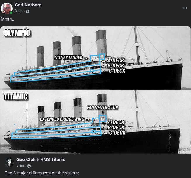 De 3 stora skillnaderna på systrarna:• A-Däck - både Olympic och Titanic byggdes med identisk öppnad strandpromenad. Planerna på att återställa Titanics A-däck godkändes den 14 februari 1912. I mars 1912, började de renovera hennes A-däck Promenad genom att bifoga den främre delen. Påståendena om att de stänger Titanics Promenade på grund av havsspray är en myt. Promenaden var inhägnad på grund av förmånen att ge First-Class passagerare mer privata ytor.• B-Däck - precis som A-Däck byggdes både Olympic och Titanic med identisk layout på slipbanorna. Planerna på att återställa Titanics B-däck godkändes i juni 1911, och renoveringen började i början av september 1911. Efter att Titanic sjönk fick Olympic samma akterdesign av sin förlorade syster.• C-Däck - till skillnad från A & B-Däck, C-Däck på både Olympic och Titanic blev inte ommonterade. Båda systrarna hade en egen layoutdesign. På avstånd kan de lätt ses identiska men närbild, de är olika. Mittensektionen av överbyggnaden av Titanics porthål är uppdelade i sex stora porthål åtföljda av små porthål som delar dem, och på Olympic är mittensektionen inte uppdelade.Lite extra:• Bridge-ving - på Titanic förlängdes vingarna ut som på Olympic, det var de inte.• Ventilatorer - Titanic var först med att ta emot den främre fläktventilatorn innan Olympic. Titanic fick sitt i slutet av februari 1912 och Olympic fick sitt i första veckan i mars 1912.Lite extra:• Portside bogsporthål - både Titanic och Olympic sjösattes från sin slipbana med totalt 14 porthål. Efter augusti 1911 lades ytterligare två porthål till Titanic. Som två lades till Olympic också när hon återvände till Belfast hösten 1911 för en och en halv månads vistelse. Det blev som avslutning med uppdateringen från planer som gjorts på Titanic för mer belysning och ventilation. Dessutom finns det ett foto av Titanic från september 1911 som visar ombyggnaden av B-däck har börjat och det visar henne också med 14 porthål. Och senare i ett foto från december 1911 ses Titanic med 16 porthål som bekräftar att hon fick sina ytterligare två porthål hösten 1911.