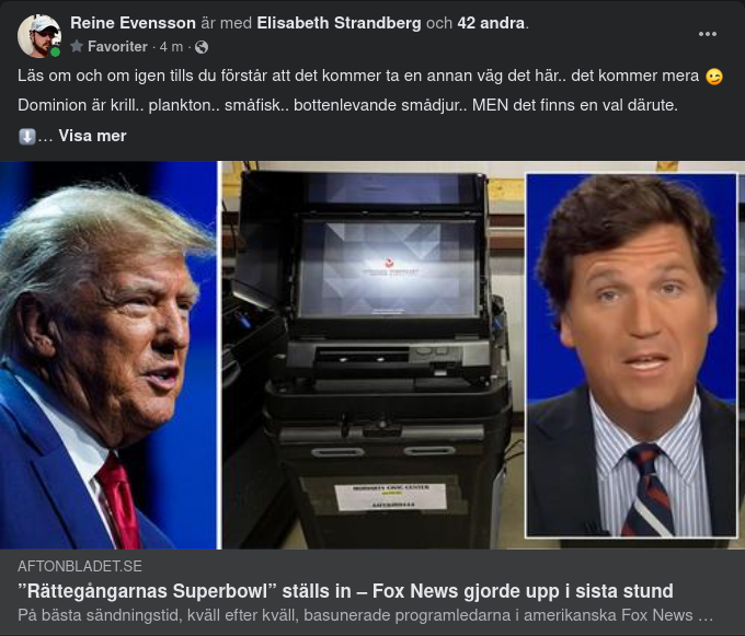 "Washington — Dominion Voting Systems and Fox News have reached a deal to resolve the $1.6 billion defamation case the electronic voting company brought against the cable news giant over unfounded accusations broadcast on its air that Dominion helped rig the 2020 presidential election against former President Donald Trump. Dominion attorneys told reporters that Fox would pay $787.5 million to settle the lawsuit soon after Delaware Superior Court Judge Eric Davis announced that the "case has been resolved." Davis had brought the jury and 12 alternates back into the courtroom following a lengthy break in proceedings. The details of the settlement are unclear, and the case's resolution came on the first day of the trial in Delaware Superior Court. A 12-member jury and the alternates were seated in the morning and sworn in, after which lawyers for the two sides were set to deliver opening statements Tuesday afternoon. The settlement brings an end to what was expected to be a six-week trial. The start of the trial had already been delayed by one day, from Monday to Tuesday. The agreement marks the culmination of Dominion's two-year lawsuit against Fox News and its parent company Fox Corporation over false claims about the integrity of the 2020 election and spares the network's top stars and co-founder Rupert Murdoch from having to take the stand. The electronic voting company alleged Fox defamed it by broadcasting unfounded allegations that Dominion had rigged the election against Trump and its software manipulated vote counts. The electronic voting company sought $1.6 billion in damages. Evidence was expected to be voluminous at the trial, after filings from Dominion's and Fox's legal teams indicated there would be over 7,000 and more than 5,000 exhibits, respectively. Before the trial, reams of text messages and internal emails from Fox's hosts, producers and executives were made public as part of the lawsuit, and many showed the network's best-known stars didn't believe the claims that were being pushed by the former president and his allies. The communications also provided a behind-the-scenes look at the atmosphere inside Fox after the network was the first to call Arizona for Joe Biden on election night. The move led viewers to change the channel from Fox to rival networks amid pushback from Trump and his campaign, setting off alarm bells within the cable giant. Dominion pointed to 20 statements — many made by conservative lawyers Sidney Powell and Rudy Giuliani — aired on shows hosted by Maria Bartiromo, Lou Dobbs, Jeanine Pirro, Tucker Carlson and Sean Hannity or on Twitter that the voting equipment and software company argues were defamatory. The trial was expected to be a high-stakes test of the boundaries of the First Amendment, as Fox's lawyers argued the claims it aired about Dominion were newsworthy, because Trump's top allies and lawyers had made the statements, and also because of when the statements were made and what they concerned. Fox also claimed that the broadcasts are constitutionally protected. But in an opinion published in late March, Davis pushed back against several of Fox's defenses, calling it "oxymoronic" to call the challenged 20 statements opinions while also asserting they were newsworthy allegations. Davis, who reviewed all 20 broadcasts where the falsehoods about Dominion were made, said in his opinion that it's "crystal clear" that none of the statements relating to the electronic voting company are true. He also rebuked Fox's attorneys during a pre-trial conference last week after Dominion alleged the cable news giant had withheld evidence and information. A lawyer for Fox apologized to Davis in a letter Friday, writing the network's legal team is "committed to clear and full communication with the Court moving forward." It's unclear whether Fox and Dominion had discussed a potential settlement earlier in the case, but the two sides previously met late last year for court-ordered mediation and did not immediately reach an agreement. "Ja tänk om det skulle ha visat sig att.. Men nu visade det sig istället att.. https://www.aftonbladet.se/nyheter/a/KnlwjM/fox-news-koper-sig-fri-arhundradets-fortalsrattegang-stalls-in?fbclid=IwAR0R45SLwOfzHObOvN2MsRpV8ZNNxGfADjhDTBWY_fWfGwJHgCoznYfgV7w Läs om och om igen tills du förstår att det kommer ta en annan väg det här.. det kommer mera Dominion är krill.. plankton.. småfisk.. bottenlevande smådjur.. MEN det finns en val därute. " -DET ÄR LÖJLIGT SÄLLSYNT " " -DÄRFÖR VAR DET OCKSÅ SÅ MÄRKLIGT ATT FOX NEWS INTE KÖPT SIG FRIA OCH PÅ SÅ SÄTT UNDVIKIT EN RÄTTEGÅNG. " Läs nedan om och om igen tills du förstår att det kommer ta en annan väg det här.. det kommer mera " Meddelandena skulle bli Dominions starka kort i rättegången. De skulle bevisa att Fox News visste att det de förmedlade som en sanning till sina tittare var ren och skär lögn. – Det är löjligt sällsynt att ha ett förtalsmål, där målsäganden kan visa juryn en serie uttalanden som direkt säger ”det här är en lögn”. Eller ”det här är galet”. Eller ”det här är löjligt” eller ”den här källan ljuger”, säger RonNell Andersen Jones, forskare vid University of Utah till The Guardian. " " Att få till stånd en förtalsrättegång i USA är svårt. Kraven är mycket höga. Det krävs att den drabbade kan bevisa att den som stäms medvetet har spridit lögnerna eller hänsynslöst ignorerat sanningen. Men det kunde Dominion. Därför var det också så märkligt att Fox News inte köpt sig fria och på så sätt undvikit en rättegång. Men det gjorde de – i sista stund. " Läs ovan om och om igen tills du förstår att det kommer ta en annan väg det här.. det kommer mera