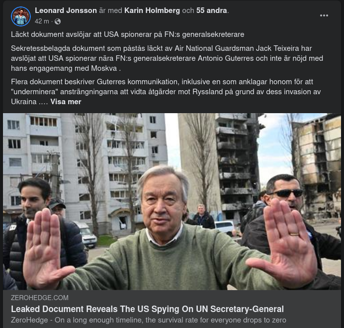 Läckt dokument avslöjar att USA spionerar på FN:s generalsekreterare Sekretessbelagda dokument som påstås läckt av Air National Guardsman Jack Teixeira har avslöjat att USA spionerar nära FN:s generalsekreterare Antonio Guterres och inte är nöjd med hans engagemang med Moskva . Flera dokument beskriver Guterres kommunikation, inklusive en som anklagar honom för att "underminera" ansträngningarna att vidta åtgärder mot Ryssland på grund av dess invasion av Ukraina . Dokumentet tar upp hans kommunikation med Moskva angående spannmålsaffären som låste upp Ukrainas hamnar vid Svarta havet. För att förmedla affären mellan Moskva och Kiev gick FN med på att hjälpa till att underlätta exporten av ryskt gödningsmedel och spannmål, som har hindrats av västerländska sanktioner trots undantag för jordbruksvaror. Dokumentet lyder: "FN:s generalsekreterare Guterres vidtar åtgärder för att tillmötesgå Ryssland i ett försök att skydda Black Sea Grain Initiative (BSGI). Som han anser är en avgörande FN-framgång och nyckel till att ta itu med den globala livsmedelsosäkerheten, och hans handlingar undergräver bredare ansträngningar för att hålla Moskva ansvarigt för sina handlingar i Ukraina." Dokumentet skrevs sannolikt antingen i slutet av februari eller början av mars innan Ryssland och Ukraina kom överens om att förlänga spannmålsavtalet den 18 mars. Det står i början av februari att Guterres "manade Rysslands utrikesminister Sergey Lavrov i ett brev att förnya BSGI innan dess mandatperiod löper ut den 18 mars. Guterres betonade sina ansträngningar att förbättra Rysslands förmåga att exportera, även om det involverar sanktionerade ryska enheter eller individer, enligt FISA-härledda signalunderrättelser." Läckt dokument som visar USA:s underrättelsetjänst om Guterres: Signalintelligens avser information som erhållits genom avlyssning av kommunikation. Som svar på avslöjandet att USA spionerar på Guterres, sa hans talesman, Stephane Dujarric, till Al Jazeera att han "inte är förvånad över det faktum att folk spionerar på honom och lyssnar på hans privata samtal". "Vad som är förvånande är missbruket eller inkompetensen som gör att sådana privata samtal kan förvrängas och bli offentliga", sa Dujarric. Andra dokument beskriver privat kommunikation mellan Guterres och hans ställföreträdare.....