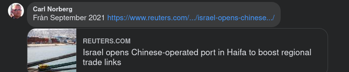 https://www.dn.se/varlden/kina-erbjuder-israeler-och-palestinier-att-medla-om-fred/?fbclid=IwAR3XNuFE1rKg3jKnMJt6_LiIUiHguVAeJ6CEMS9DhBbIadLBO5ytR09BKLw " Kina försöker få till stånd en dialog mellan Israel och det palestinska självstyret. I veckan meddelade utrikesminister Qin Gang sina kollegor i Jerusalem och Ramallah att Kina står till deras förfogande som medlare. Under samtal med utrikesministrarna Eli Cohen och Riyad al-Maliki uppmanade Qin Gang parterna att ”visa politiskt mod” och göra ett nytt försök att bilägga konflikten. Han hävdade att Kinas framgångsrika medling nyligen mellan de forna fienderna Saudiarabien och Iran vore en fruktbar modell för israelisk-palestinska fredsförhandlingar. I ett samtal med DN välkomnar en högt uppsatt källa på utrikesdepartementet i Ramallah på Västbanken det kinesiska initiativet: – Detta är goda nyheter! Vi har inte sett till något seriöst fredsinitiativ sedan 2014. Donald Trumps så kallade fredsplan 2020 var en israelisk plan i amerikansk förpackning. Vi tror att Kina har helt andra möjligheter att mäkla fred än USA. Den israeliska reaktionen är mindre entusiastisk. Enligt det kinesiska utrikesdepartementet välkomnade Eli Cohen alla försök till avspänning i regionen, men tillade att han inte ser några möjligheter att lösa Israel–Palestina-konflikten vid denna tidpunkt. Sanningen är ju att det inte finns något stöd alls för fredssamtal i den israeliska koalitionen. Tvärtom skulle seriösa förhandlingar om den ockuperade Västbankens framtid troligtvis spränga regeringen. Två av koalitionspartierna vill upphäva Västbankens tre zoner – A-, B- och C-områdena – och återgå till den direkta ockupation som rådde fram till 1994, vilket inte lämnar någon öppning för dialog med palestinierna. I sitt officiella svar på den kinesiska inviten, på Twitter, uppmanade utrikesminister Eli Cohen Kina att övertala Iran att överge sitt kärnvapenprogram, som enligt experter är mycket nära sin fullbordan. På kinesiska UD är man förstås på det klara med att Israel inte är moget för en fredsuppgörelse. Men redan kontakter på låg nivå, eller ”sonderingar” inför eventuella samtal, skulle befästa Kinas nya image som regionens nya diplomatiska huvudaktör – på USA:s bekostnad. Kina har på senare år närmat sig inte bara USA-fienden Iran, utan ingått viktiga ekonomiska avtal med USA:s allierade i regionen, främst Israel, Egypten och Saudiarabien."https://www.reuters.com/world/middle-east/israel-opens-chinese-operated-port-haifa-boost-regional-trade-links-2021-09-02/?fbclid=IwAR0s2X3RnEvXTBRJOpAVDkJm2mYyUDmCM5HkPJuec25A5VifdK1Nk-7dArw