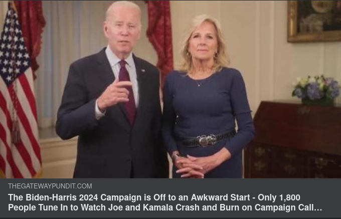 https://www.thegatewaypundit.com/2023/04/the-biden-harris-2024-campaign-is-off-to-an-awkward-start-only-1800-people-tune-in-to-watch-campaign-call-with-grassroots-supporters-video/?fbclid=IwAR0oIjKgSKLOI5afG11sfVtcShLs1cZXmCtBNL09LhSZVVlIiEx_YESYdao