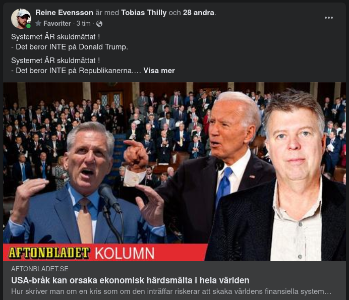 Systemet ÄR skuldmättat ! - Det beror INTE på Donald Trump. Systemet ÄR skuldmättat ! - Det beror INTE på Republikanerna. Systemet ÄR skuldmättat ! - Det beror INTE på USA. Systemet ÄR skuldmättat ! - Det beror INTE på Putin. Systemet ÄR skuldmättat ! - Det beror INTE på Ryssland. Systemet ÄR skuldmättat ! - Det beror INTE på Xi Jinping. Systemet ÄR skuldmättat ! - Det beror INTE på Kina. Systemet ÄR skuldmättat ! - Det beror INTE på Recep Tayyip Erdogan. Systemet ÄR skuldmättat ! - Det beror INTE på Turkiet. Systemet ÄR skuldmättat och skuldmättnadspunkten nåddes inte idag direkt. Försök nu förstå vilken hovnarr Wolfpuck är.. https://www.aftonbladet.se/nyheter/kolumnister/a/rlb35m/republikanerna-anvander-skuldtaket-som-utpressningsverktyg?fbclid=IwAR2v4aZC0naVkhfyM9asHWHsrq_sbxIgIOAC7D1HKaEL9Kgd7H9d7xy3Wog USA-bråk kan orsaka ekonomisk härdsmälta i hela världen. Hur skriver man om en kris som om den inträffar riskerar att skaka världens finansiella system i grunden men som alla tror kommer att undvikas i sista stund? Allt beror på om republikanernas ledare Kevin McCarthy gör allvar av sitt hot att vägra höja USA:s skuldtak. Ska man slå på trumman och varna eller tiger man och utgår från att allt löser sig till slut? Vi har sett liknande kraftmätningar förr. Senast 2011 då republikanerna förde USA till randen av en ekonomisk katastrof genom att vägra höja skuldtaket så att USA kunde betala sina räkningar. Den gången nåddes en lösning så sent inpå deadline att USA fick sitt kreditbetyg sänkt och världens börser upplevde sin värsta vecka sedan finanskrisen 2008. Allting är egentligen en politisk kamp där republikanerna försöker pressa ut politiska eftergifter i utbyte mot att gå med på att höja skuldtaket. Det kan tyckas som ett ansvarslöst beteende men tanken är att det ska hjälpa dem att vinna valet 2024 som också råkar vara ett presidentval. Men det är ett högt spel McCarthy spelar. Kan inte USA betala sina räkningar innebär det inte bara ekonomisk ruin för många amerikaner. Hela världen riskerar att skakas av en ekonomisk härdsmälta. Och republikanerna kommer att få skulden för det. Den här gången seglade den potentiella krisen upp sedan finansminister Janet Yellen varnat för att det efter 1 juni inte längre finns tillräckligt med pengar i den amerikanska statskassan för att betala landets räkningar. Datumet är dock inte skrivet i sten. Fanatiska talesmän USA lever sedan lång tid tillbaka över sina tillgångar. Det har resulterat i ett gigantiskt budgetunderskott. Men eftersom dollarn är en så stark valuta och amerikanska statspapper anses säkrast i världen har landet inga problem att få låna pengar på bra villkor. Men för att tvinga de styrande att handskas försiktigt med skattebetalarnas pengar har det länge funnits ett skuldtak. Helt enkelt en summa som blir en gräns efter vilken staten inte får låna upp mer pengar även om man kan det. Under många år höjdes skuldgränsen mer eller mindre automatiskt men i takt med att den amerikanska politiken blivit alltmer polariserad har skuldtaket av framförallt republikanerna använts som ett politiskt vapen. Det blev extra tydligt under Donald Trumps period som president. Han höjde utgifterna rejält genom att stötta privatpersoner och företag under pandemin. Den gången var det inga republikaner som hotade med att inte höja skuldtaket eller klagade över att utgiftsökningen var oansvarig. Det är när det sitter en demokrat i Vita huset som republikanerna blir närmast fanatiska talesmän för finansiell disciplin. Den gångna mandatperioden har Biden drivit igenom flera stora reformpaket för att hjälpa till med återhämtningen efter pandemin och för att få fart på den gröna omställningen i USA. Låst läge mellan Biden och McCarthy Reformer som republikanerna i grunden ogillar eftersom de ökar de statliga utgifterna. Republikanernas grundinställning är att staten ska göra så lite som möjligt. Alla är överens om att USA:s stora budgetunderskott är ett problem. Däremot är man helt oense om hur det ska lösas. Republikanerna vill betala av på statsskulden genom att skära ner statens utgifter. Något demokraterna bestämt avvisar. Demokraterna vill i stället höja skatterna för företagen och de rika. Något republikanerna absolut inte kan tänka sig gå med på. Ännu finns inga tecken på en uppgörelse mellan Biden och McCarthy. När de två träffades i tisdag för att försöka hitta en kompromiss satt de demonstrativt långt ifrån varandra i Ovala rummet. Inget kom ut av mötet utom att de ska träffas igen och beskedet att båda inser lägets allvar. Nu ökar pressen dag för dag på att lösa situationen. Läget försvåras av att inget parti själva kan avgöra frågan. Demokraterna har en liten majoritet i senaten och republikanerna behärskar med tämligen knapp marginal representanthuset. Nästa års presidentval komplicerar dessutom situationen eftersom båda partier vill positionera sig på ett sätt som de tror ska ge dem segern. Räknar kallt med en uppgörelse Än så länge har panikstämningen inte börjat sprida sig till världens börser. Alla räknar kallt med att det blir en uppgörelse. Men ju närmare den 1 juni vi kommer utan att det finns en lösning desto skakigare kommer det att bli. För många är det otänkbart att USA skulle kunna gå i konkurs men om det verkligen händer så är följderna oöverblickbara. USA har ansetts vara själva garanten för finansiell stabilitet i världen. Exakt vad som händer om USA ställer in betalningarna är omöjligt att säga eftersom det aldrig skett tidigare. Så låt oss hoppas att vi slipper få reda på det. Världen har tillräckligt med kriser utan att vi ska behöva utstå en som amerikanska politiker tillverkar på egen hand.