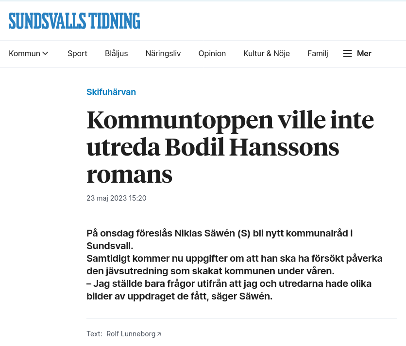 https://www.st.nu/2023-05-24/svart-kanna-fortroende-for-de-som-styr-kommunen?fbclid=IwAR1ZetEqXTun1OerzJoMOwoQWTOrpi1qQqiYGQLb0u1OV7B6IMbQ-6BaXU4 "När ska den strida strömmen av skandaler ta slut hos Sundsvalls kommun? Under flera år har det ena efter det andra missförhållandet avslöjats av media. Skandalerna är oftast kopplade till den administrativa eller politiska ledningen. Vad beror det på? Är det helt enkelt bristande kompetens eller någon form av storhetsvansinne? När ska den strida strömmen av skandaler ta slut hos Sundsvalls kommun? undrar signaturen "Stickan". I en artikel i ST 24/5 framkommer att det finns uppgifter om att Niklas Säwén (S) försökt påverka den externa utredningen avseende jäv runt det tidigare kommunalrådet. En utredning där han själv figurerar. Ofattbart! Trots Säwéns inblandning i turerna runt jäv och kritiken mot honom i den externa utredningen, ser han ut att bli nominerad som nästa kommunalråd. Hur är det möjligt? Finns det inga oförvitliga socialdemokrater att välja? Även den i utredningen kritiserade kommundirektören verkar sitta ohotad på sin stol. Det är helt absurt. Hur ska vi invånare ha minsta lilla förtroende kvar för er som styr kommunens verksamhet? "Stickan" https://www.st.nu/2023-05-23/kommuntoppen-ville-inte-utreda-bodil-hanssons-romans?fbclid=IwAR2BaH5zx0r9fHgmaejvqjMqcCSXj9cuP-lQv_CULEx5VFCgD9DXcMt3dbM På onsdag föreslås Niklas Säwén (S) bli nytt kommunalråd i Sundsvall. Samtidigt kommer nu uppgifter om att han ska ha försökt påverka den jävsutredning som skakat kommunen under våren. – Jag ställde bara frågor utifrån att jag och utredarna hade olika bilder av uppdraget de fått, säger Säwén. Niklas Säwén (S) föreslås som ny kommunstyrelseordförande efter Bodil Hansson. Lisa Tynnemark (t.v) är valberedningens förslag till vice ordförande. Avgörandet sker vid arbetarkommunens möte i veckan. ST kan publicera de nya uppgifterna kort innan Niklas Säwén formellt kommer att föreslås som ny kommunstyrelseordförande i Sundsvalls kommun. Han uppges under våren ha ifrågasatt hur kommunens externa utredare utförde den jävsutredning som senare ledde till allvarlig kritik mot kommunalrådet Bodil Hansson (S) och kommundirektören Jonas Walker. Av ett internt mejl som ST tagit del av ska Niklas Säwén ha sagt att det inte var utredarnas sak att gå till botten med det som utlöst hela händelsekedjan – det vill säga relationen mellan Bodil Hansson och Skifus tidigare vd, Peter Clemin. Detta trots att utredarnas uppdrag formulerats av kommunens finansutskott, där han själv inte är med. – Jag ställde frågor till utredarna om det var nödvändigt att gå in på sådant som kan vara integritetskänsligt för de inblandade, men jag har inte haft ambitionen att försöka dölja något. Tvärtom har jag hela tiden välkomnat utredningen, säger Niklas Säwén. ...jag har inte haft ambitionen att försöka dölja något Bakgrunden är en serie händelser som skakat Sundsvalls kommun sedan Bodil Hansson i höstas berättade om hur hon i kölvattnet av Skifuhärvan utsatts för påtryckningar och hot. Hon berättade då om en hemlig romans med den tidigare Skifu-vd:n, vilket i sin tur väckte frågor om intressekonflikter och jäv. Det här utreddes först internt och sedan externt av Hellströms advokatbyrå som i april kom till slutsatsen att Bodil Hansson gjort sig skyldig till flera fall av jäv. Vägen fram till slutsatsen var dock inte helt rak. Advokatbyrån hade fått ett öppet mandat att gå till botten med jävsfrågan, men deras arbete ifrågasätts under resans gång, visar det sig. Till ST säger sig Säwén ha fått information om att det var händelserna efter påtryckningsförsöket som skulle granskas – inte relationen. Det var därför han reagerade, säger han. Att han skulle ha försökt bromsa eller påverka utredningen avvisar han bestämt. Advokatbyråns mejl efter att de intervjuat Niklas Säwén (S). De vänder sig till kommunens säkerhetschef, Alexandra Lagerlund, och vill ha besked om de ska gå till botten med relationen eller inte. Utredningen fokuserade på tre personer: Förutom huvudpersonen Bodil Hansson granskades även kommundirektören Jonas Walker och Niklas Säwén, som var de som först fick veta om påtryckningarna och den hemliga relationen. Men efter att de intervjuat Niklas Säwén hör advokatbyrån av sig till kommunen och berättar att han sagt att det inte ingår i deras uppdrag att utreda omfattningen på relationen mellan Hansson och Clemin. Det här beskedet från Säwén skapar förvirring hos advokatbyrån. De mejlar kommunen om besked. "Enligt vår uppfattning utgör relationens omfattning en av de viktigaste komponenterna", skriver de och vill veta om de ska utreda relationen eller inte. Man ville ju ha en oberoende utredning och jag följde bara vad de bestämt Kommunens säkerhetschef fick fälla avgörandet: "Man ville ju ha en oberoende utredning och jag följde bara vad de bestämt", säger Alexandra Lagerlund. Avgörandet hamnar hos kommunens säkerhetschef Alexandra Lagerlund som fått finans- och näringslivsutskottets uppdrag att sköta kontakterna med advokatbyrån. Hon kommer till slutsatsen att relationen ska utredas. – Jag utgick från vad den parlamentariska gruppen i finans- och näringslivsutskottet hade bestämt. Man ville ju ha en oberoende utredning och jag följde bara vad de bestämt, säger hon. Uppfattar du det här som ett försök att påverka utredningen? – Det kan jag inte svara på. Jag var inte med vid själva intervjun utan fick uppgift i efterhand om att det förekommit frågor om utredningens omfattning. I sitt mejlsvar till advokatbyrån tidigare i vår formulerar hon sig rakare; ".. personer som nu är föremål för utredning varken ska eller bör försöka påverka utredningens inriktning", skriver hon. När utredningen sedan är klar visar det sig att advokatbyrån, till följd av den