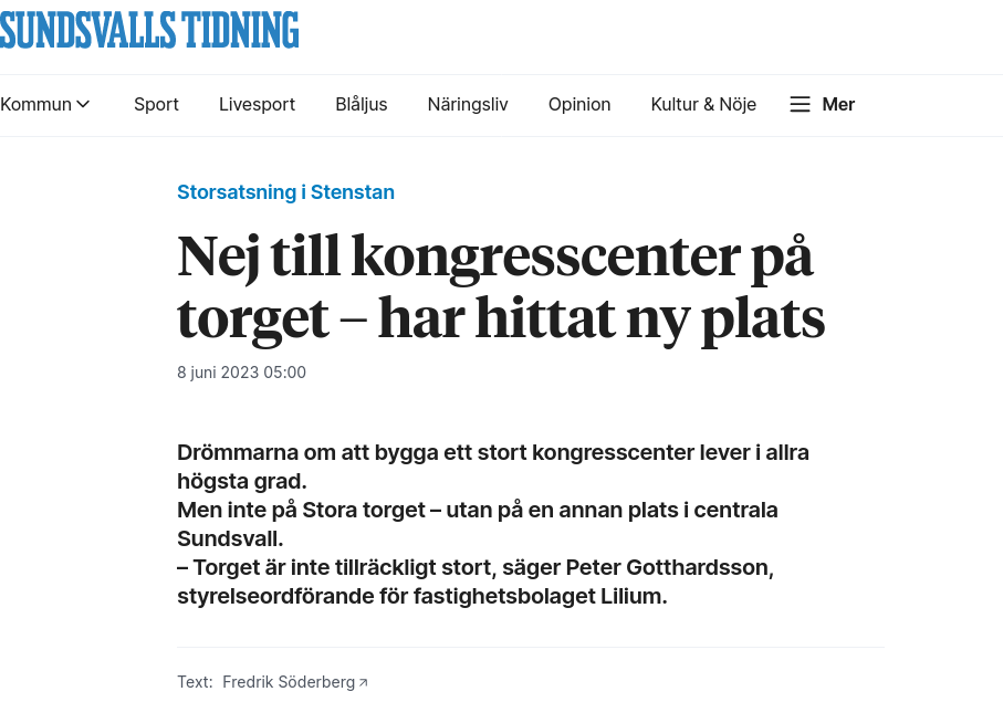 https://www.st.nu/2023-06-08/nej-till-kongresscenter-pa-torget-har-hittat-ny-plats?fbclid=IwAR0cEAsEBDRzEBLpsihqUMEyi9Se0SeGV025paDzmLahC7gzeV8Wac4sUHU "I oktober 2021 presenterande Peter Gotthardsson planerna på Bünsow Business Growth Forum i Stadshuset. Ett stort kongresscenter skulle ta plats på Stora torget där restaurang Bloco i dag bedriver sin verksamhet. – Det skulle sätta Sundsvall på kartan, sa han då. Nyheten skapade stor debatt och många hade åsikter kring den byggnad som Gotthardsson visade skisserna på. Sedan dess har arbetet fortsatt, men inriktningen har förändrats. ST kan nu berätta att torget inte längre är aktuellt. – Byggnaden får inte plats på torget. Vi ser att vi kommer att få problem med logistiken. En sådan här byggnad kräver en bra tillgänglighet och det ska gå smidigt att ta sig in med stora lastbilar. Den behöver också vara tillräckligt stor för att rymma de funktioner vi vill få plats med. Det kommer vi inte att lyckas med på torget, säger Peter Gotthardsson. Hur har ni kommit fram till detta? – Vi har varit runt i olika städer och tittat på liknande anläggningar. Efter dessa besök har det växt fram att vi behöver hitta en annan central plats. I höst blir den andra utredningen klar. "Utifrån denna vet vi sedan hur projektet ska gå vidare", säger Gotthardsson. Istället är siktet inställt på området nedanför Kulturmagasinet vid Selångersån som har använts som uppställningsyta för bussarna. – Det är en mer lämplig plats som vi tror kommer att passa betydligt bättre. Det tar bara några minuter att gå till stadskärnan, säger Peter Gotthardsson. Något som kommunen också verkar vara inne på. I en rapport som släpptes för en tid sedan med anledning av den stora etableringen i Torsboda pekades området som kallas Norra Stenstan ut som en lämplig plats för det stora kongresscentret. – Vi har fört diskussioner med kommunen och de tycker också att det är en betydligt bättre plats, säger Peter Gotthardsson. Peter Gotthardsson tror att den nya platsen vid Selångersån kommer att passa bättre än torget. Arbetet går nu vidare för att skapa förutsättningar och finansiering för ett stort bygge. – Det är för tidigt att säga hur en finansieringslösning skulle kunna se ut. Vi kommer säkert att finnas med i någon form tillsammans med andra aktörer i näringslivet. Men det kommer att behöva ske i samarbete med både kommun och region, säger Peter Gotthardsson. Hur går arbetet vidare nu? – Vi har gjort en förstudie som inriktades på att ta reda på om det fanns förutsättningar. Och det gör det. Nu är vi inne i nästa utredning som går ut på att ta fram ett beslutsunderlag. Den blir klar i höst. Utifrån denna vet vi sedan hur projektet ska gå vidare."