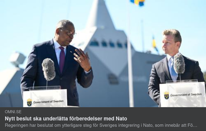 https://omni.se/natosoldater-kan-placeras-tillfalligt-i-sverige/a/Q7KE7q?fbclid=IwAR1mbm7mhC1eR4A8e0IJudztdye3x9e79RW7zOCxbbr8JqnsTsGnMeq2fRE När Sverige står inför det allvarligaste säkerhetshotet sedan andra världskrigets slut kan regeringen inte bara hoppas på det bästa, skriver statsminister Ulf Kristersson (M) och försvarsminister Pål Jonson (M) på DN Debatt. Vid det värsta tänkbara scenariot måste det gå fort att få in andra länders militära resurser på svensk mark. Därför får nu Försvarsmakten möjlighet att förbereda detta med Natoländer, skriver Kristersson och Jonson. Det innebär också att Natoländer får möjlighet att tillfälligt placera personal och material på svenskt territorium, i veckor eller under längre perioder. Det stärker Sveriges trovärdighet, skriver debattörerna, och skickar ”en tydlig signal till Ryssland att vår förmåga att ge och ta emot militär hjälp är god.”https://omni.se/nytt-beslut-ska-underlatta-forberedelser-med-nato/a/l3LlWL?fbclid=IwAR1Q6xjWfkYE9ifXt17KL68zu2SXnIKIsvzs-GvR01zuaC4ISvhsHcb7ysI Regeringen har beslutat om ytterligare steg för Sveriges integrering i Nato, som innebär att Försvarsmakten får vidta förberedelser med alliansen och enskilda medlemstater. Syftet är enligt ett pressmeddelande att ”verka konfliktavhållande i närområdet” och innebär bland annat att utländsk militär kan få tillfällig basering på svensk mark. – Det kraftigt försämrade säkerhetsläget i vårt närområde efter Rysslands anfallskrig mot Ukraina har visat på vikten av att Sverige har ett nära operativt samarbete med Nato, säger försvarsminister Pål Jonson (M).