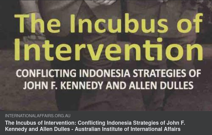 https://www.internationalaffairs.org.au/australianoutlook/the-incubus-of-intervention-conflicting-indonesia-strategies-of-john-f-kennedy-and-allen-dulles/?fbclid=IwAR2V33JDgLaywNLXAQNKTMjjGbZmVtQcrhPrADdJIKtnG9uMXwLnBjX0_sY "Denna fängslande berättelse börjar med tre holländare på toppen av ett berg av guld i Nederländska Nya Guinea 1936 och slutar med mordet på USA:s president John F Kennedy i november 1963. Den Brisbanebaserade akademikern Greg Poulgrain tar också läsarna genom förkrigstidens Konstantinopel och Paris. till Belgiska Kongo för FN:s generalsekreterare Dag Hammarskjölds död 1961. Hans syfte är att bygga upp en rad bevis för att anklaga den legendariske amerikanska chefen för Central Intelligence Agency (CIA), Allen Dulles, för att sabotera tredje världens ledare och andra som hotade amerikanska strategiska och kommersiella intressen. I synnerhet hävdar han att Dulles, bror till den formidable utrikesministern John Foster Dulles, arbetade outtröttligt för att destabilisera Indonesiens kvicksilverpresident Sukarnos styre på 1950- och 60-talen. Det avgörande är att Poulgrain ifrågasätter hur historien skulle ha utvecklats om USA inte hade tränat den indonesiska militären för att vara en pro-västerländsk "stat i en stat". Denna aktion banade väg för den brutala Suhartoregimen som släppte lös de blodiga antikommunistiska utrensningarna 1965-66. Dessutom ställer han den spännande frågan om vad som skulle ha hänt om Kennedy hade undvikit mördarens kula och överlevt för att implementera sin alternativa strategi att använda massivt medborgarstöd för att föra in skärgården i det västra lägret. Den karismatiske amerikanska presidenten hade planerat att besöka Jakarta i början av 1964 i ett försök att starta om hjälpprogrammet och försegla ett avtal med Sukarno för att avsluta "Konfrontasi"-kampanjen mot Malaysia. Med Kennedy borta vände sig Sukarno mot väst och hans land hamnade snabbt i kris. Poulgrain är en historiker med ett praktiskt förhållningssätt, som odlar långvariga relationer med några av karaktärerna i sina berättelser. Medan han undersökte material till en tidigare bok, The Genesis of Konfrontasi , bodde han i månader med AM Azahari, den nationalistiska politikern som anklagades för Brunei-revolten 1962 - en stor händelse i upptakten till den indonesisk-malaysiska konfrontationen. Detta får Poulgrain att dra slutsatsen att Storbritannien spelade en nyckelroll i att provocera Konfrontasi eftersom de ville lägga vantarna på Brunei-olja. Medan han undersökte Incubus intervjuade författaren Jean Jaques Dozy, den holländska geologen som upptäckte Ertsbergs och Grasbergs guld- och kopparfyndigheter i Nederländska Nya Guinea 1936. Detta var verkligen ett "El Dorado", det största guldfyndet i historien, men det var det inte fram till 1972 att det amerikanska företaget Freeport McMoran började bryta i området. Poulgrain anser att de holländska koloniala myndigheterna och amerikanska företagsintressen dolde fyndets sanna natur tills det kunde exploateras på ett säkert sätt, medan Dozy tillskriver förseningen till de extrema utmaningarna med gruvdrift på höga höjder på en så avlägsen plats. Poulgrain bygger också på intervjuer med Joseph Luns, den nederländska utrikesministern som tjänstgjorde som Natos generalsekreterare, general Nasution, Indonesiens försvarsminister (1959-66) och George Ivan Smith, den australiensiske diplomaten som arbetade nära FN:s generalsekreterare Dag Hammarskjold. . I centrum för hans berättelse står Allen Dulles, advokat-diplomaten som blev den mäktigaste direktören (1953-61) i CIA:s historia. Författaren hävdar att Dulles hade ett antal motiv för att vilja att Sukarno skulle avsättas av en militärledd regim som var anpassad till väst. Förutom att söka ett antikommunistiskt tillslag, hade den listiga amerikanen förmedlat affärer mellan de holländska och amerikanska oljeintressena på 1930-talet och kände till Grasbergs guldbonanza. Höjdpunkten i USA:s ansträngningar att fördriva Sukarno kom 1958 när CIA, med hjälp av Australien, stöttade regionala rebeller i Sumatra och Sulawesi med ammunition och luftskydd. Kampanjen var en farsartad flopp med pro-Jakarta trupper under General Nasution som snabbt dirigerade rebellerna. I kölvattnet av detta misslyckande koncentrerade sig Dulles på att odla stöd bland antikommunistiska indonesiska generaler. Författaren tror också att CIA utnyttjade Konfrontasi-krisen för att fördjupa den kinesisk-sovjetiska splittringen. Poulgrain betonar att Dulles var en hänsynslös man och var villig att eliminera oönskade utländska ledare. I synnerhet citerar han upptäckten av en amerikansk kongresskommitté att CIA-direktören godkände mordet på Kongos premiärminister Patrice Lumumba 1961. Han citerar också dokument som avslöjats av Sydafrikas sannings- och försoningskommission, som involverar CIA i döden av Dag Hammarskjöld, som omkom i en mycket misstänkt flygolycka i Zambia i september 1961. Enligt Poulgrain ville Hammarskjöld skicka FN-officerare till Nederländerna Nya Guinea för att administrera särskild FN-biståndsfinansiering vid en tidpunkt då Jakarta och holländarna bråkade om kontrollen över territoriet. En sådan plan skulle ha ökat möjligheterna till Papuas självständighet och skulle inte ha varit till hjälp för Dulles Indonesiens strategi. I sin inledning och återigen i det avslutande kapitlet tvingar Poulgrain läsarna att överväga om Allen Dulles ens kan ha varit inblandad i mordet på Kennedy i ett försök att omintetgöra USA:s presidents indonesiska strategi. Den här recensenten köper inte denna idé men utan tvekan kommer vissa att tycka att det är en spännande möjlighet."