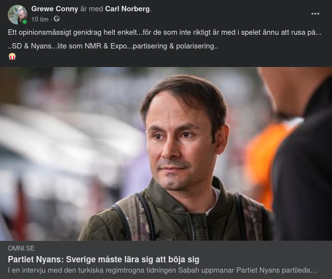 https://omni.se/partiet-nyans-sverige-maste-lara-sig-att-boja-sig/a/eJvaKM?fbclid=IwAR2zGJ8RWcECLqySlz0ZP1lnI5M2Yko8K6K1Hr1lk5U4UFPIP7mDFdKvrcM