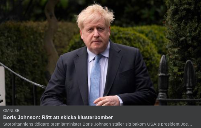 "Storbritanniens tidigare premiärminister Boris Johnson ställer sig bakom USA:s president Joe Bidens beslut om att skicka klusterbomber till Ukraina.