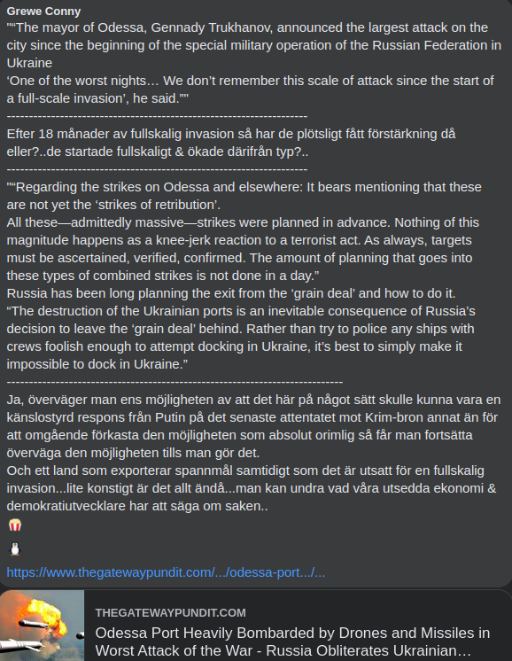 https://www.thegatewaypundit.com/2023/07/odessa-port-heavily-bombarded-drones-missiles-worst-attack/?fbclid=IwAR1sRB80B7jufs7OmhZ4j3jehX_-k7d4pWCqGKTdBPwWdAEXJsARKn9nZ_Y
