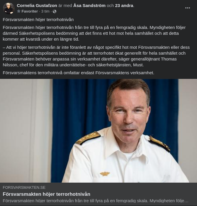 https://www.forsvarsmakten.se/sv/aktuellt/2023/08/forsvarsmakten-hojer-terrorhotnivan/?fbclid=IwAR2xX8Qs3iystfszKAOmMR5ZNYlnG8uOPtYe2VxdG4AyfdZtQewBr-fjtT0