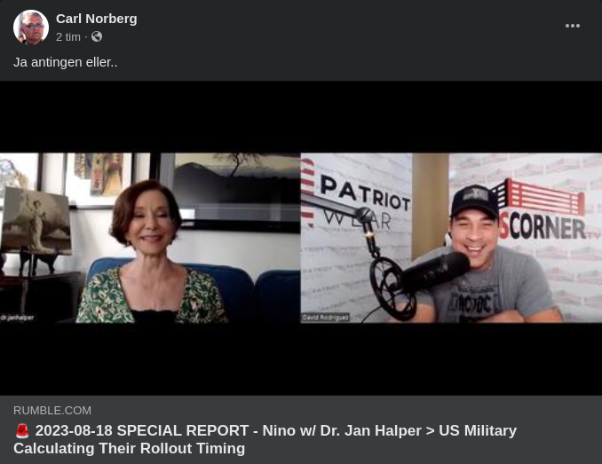 https://rumble.com/v39uo80--2023-08-18-special-report-nino-w-dr.-jan-halper-us-military-calculating-th.html?fbclid=IwAR311Nz7AB4qrzWQp79l3JLxklt2SwQXeB4LbgmdTA-MdiyxM6nMrtJjMEA