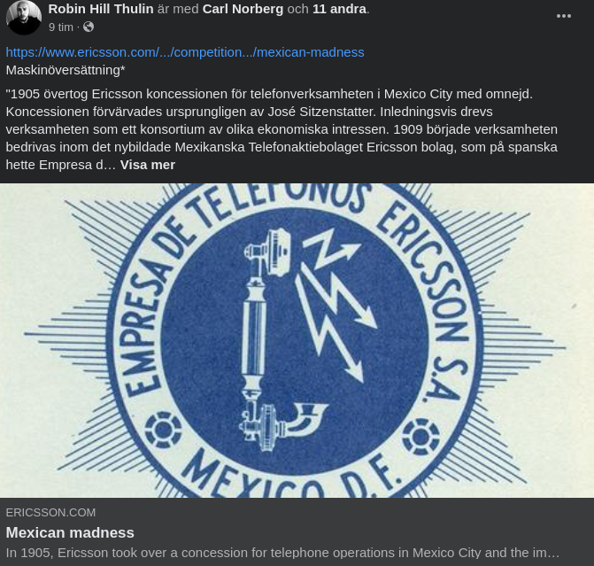 "1905 övertog Ericsson koncessionen för telefonverksamheten i Mexico City med omnejd. Koncessionen förvärvades ursprungligen av José Sitzenstatter. Inledningsvis drevs verksamheten som ett konsortium av olika ekonomiska intressen. 1909 började verksamheten bedrivas inom det nybildade Mexikanska Telefonaktiebolaget Ericsson bolag, som på spanska hette Empresa de Teléfonos Ericsson SA. Här kommer vi att hänvisa till företaget som Mexeric.