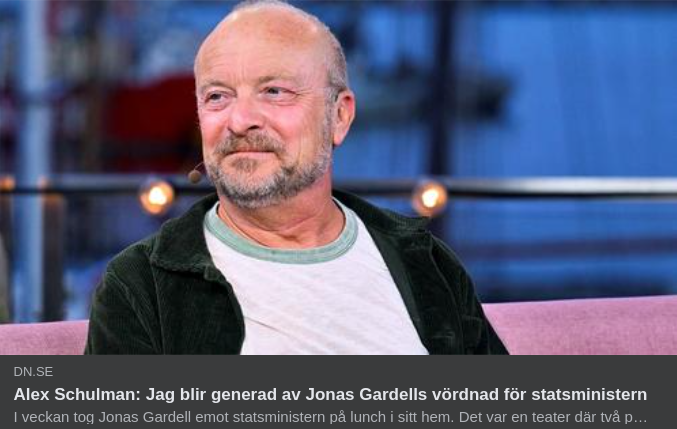 Gardells lunchgäst styr en regering med stöd av Sverigedemokraterna, vars toppnamn Björn Söder återkommande och nyligen uttryckt sitt hat mot hbtq-personer. Men när lunchen är slut är resultatet noll. Det kommer inga löften, Kristersson gör ingenting, SD är fortfarande en partner, hbtq-hataren Björn Söder sitter kvar. Alla de här minglen och luncherna, alla de här långa, långa texterna i Expressen, för ingenting. Det är bara en teater där två personer äter pasta med körsbärstomater och solar sig i varandras glans.