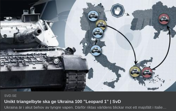 Därmed blir alla vinnare. Schweiz kan sälja sina stridsvagnar och andas ut eftersom de inte hamnar i ett krig utan i Grekland. Ett pressat Tyskland kan genomföra sin plan att hjälpa Ukraina. Grekland får mer kapabla stridsvagnar i sin armé utan kostnad. Och Ukraina får nästan hundra Leopard 1-stridsvagnar utöver de 178 som Belgien, Danmark, Nederländerna och Tyskland givit.