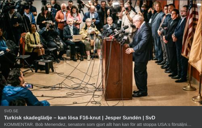 "Bob Menendez, senatorn som gjort allt han kan för att stoppa USA:s försäljning av stridsflyg till Turkiet, anklagas för mutbrott – och skadeglädjen är stor i Turkiet. Kan Menendez knipa underlätta Sveriges Natointräde?
