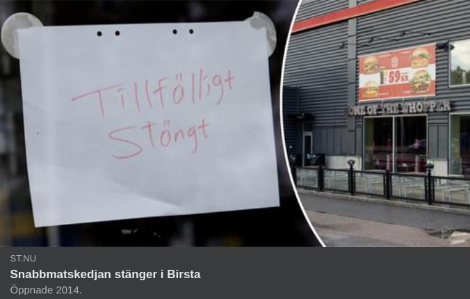 "På dörren till lokalerna sitter en lapp med texten “tillfälligt stängt” och i en handling till Miljökontoret skriver snabbmatskedjan att Kingfood AB “stänger sin verksamhet i Burger King Sundsvall”. Det framgår även att snabbmatskedjan stängning ska ske “väldigt omgående”.