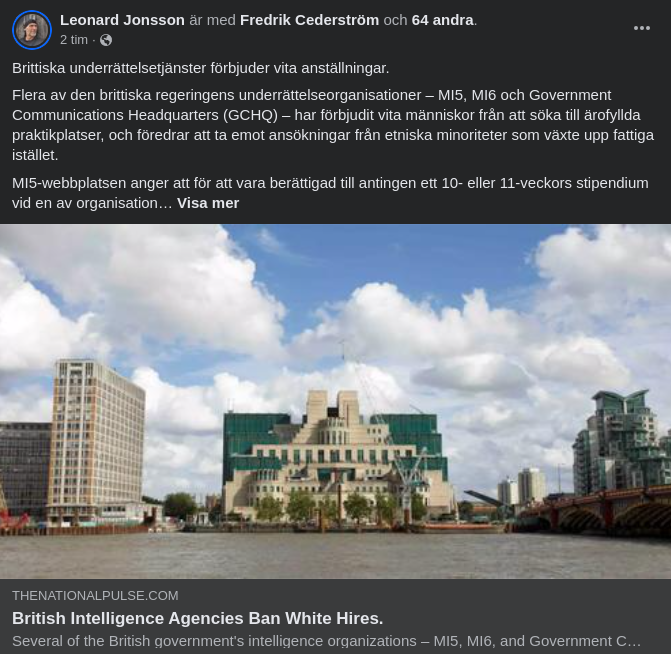 Brittiska underrättelsetjänster förbjuder vita anställningar. Flera av den brittiska regeringens underrättelseorganisationer – MI5, MI6 och Government Communications Headquarters (GCHQ) – har förbjudit vita människor från att söka till ärofyllda praktikplatser, och föredrar att ta emot ansökningar från etniska minoriteter som växte upp fattiga istället. MI5-webbplatsen anger att för att vara berättigad till antingen ett 10- eller 11-veckors stipendium vid en av organisationerna, "måste du gå ditt näst sista eller sista år på universitetet, från en svart, asiatisk eller etnisk minoritetsbakgrund, och från en socialt eller ekonomiskt missgynnad bakgrund.” Organisationerna hävdar också att de utan mångfald och inkludering inte kan utföra sin huvudsakliga funktion som är att upprätthålla säkerheten för de som bor i landet, och förklarar: "För att skydda Storbritannien behöver vi en verkligt mångfaldig arbetsstyrka som speglar samhället vi tjänar." Lediga tjänster i Storbritannien kan lagligen utesluta vita människor genom att hävda att de främjar "positiva åtgärder". Jämställdhetslagen (2010) tillstånd om uteslutningen av vita britter om det tar upp någon form av "underrepresentation eller nackdel". Detta är inte det första exemplet på att vita människor förbjuds från praktik, som Sadiq KhansTransport till London(TFL) accepterar endast icke-vita ansökningar för den årliga Stuart Ross Communications Internship.