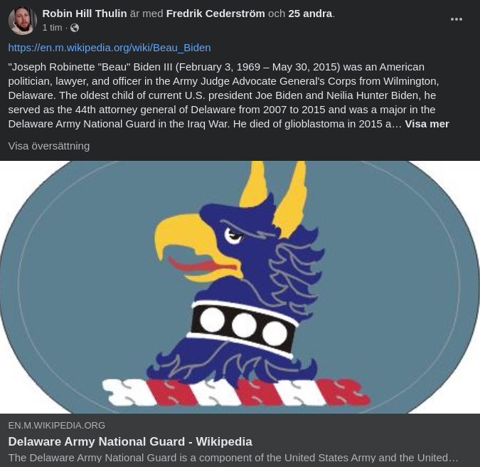 "Joseph Robinette "Beau" Biden III (February 3, 1969 – May 30, 2015) was an American politician, lawyer, and officer in the Army Judge Advocate General's Corps from Wilmington, Delaware. The oldest child of current U.S. president Joe Biden and Neilia Hunter Biden, he served as the 44th attorney general of Delaware from 2007 to 2015 and was a major in the Delaware Army National Guard in the Iraq War. He died of glioblastoma in 2015 at the age of 46.