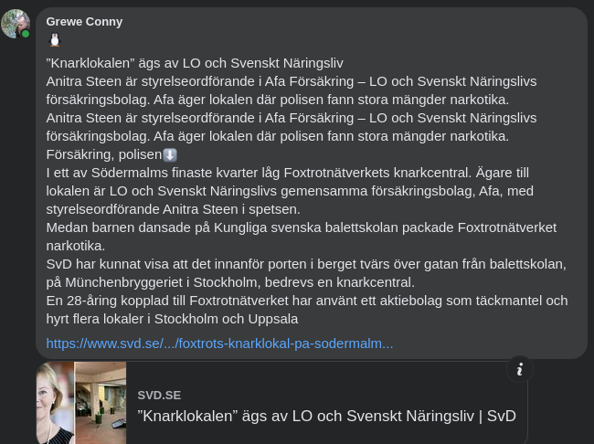 "I ett av Södermalms finaste kvarter låg Foxtrotnätverkets knarkcentral. Ägare till lokalen är LO och Svenskt Näringslivs gemensamma försäkringsbolag, Afa, med styrelseordförande Anitra Steen i spetsen.