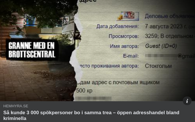 ”Hyr ut adress med brevlåda. 500 kr.” Så lyder den olagliga annonsen på den ryskspråkiga sajten Svenska palmen.