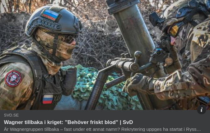 "Den ryska Wagnergruppen tycks vara på väg att återuppstå, sannolikt i ny skepnad. Det rapporteras efter uppgifter om att gruppen återupptagit rekrytering av frivilliga stridande. Rekryteringen ska ha startat i de ryska städerna Perm och Novosibirsk kring Uralbergen och Sibiren, enligt ryska och ukrainska medier. Intresserade mellan 20 och 55 år erbjuds sexmånaderskontrakt med lön mellan på motsvarande 10 000 – 28 000 kronor.