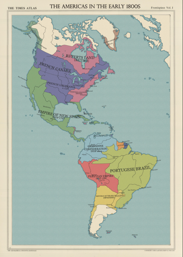 This infographic shows the Americas in the early 1800s. Credit: John Bartolomeo & Son, The Geographical Institute at Edinburgh, and The Times Atlas. Several comments made me realize that the publisher of this map instead of saying The Americas in the early 1800s, should have written The Americas in the Middle 18th century.