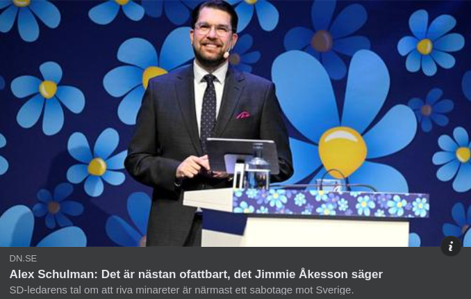 Att Åkesson väljer att säga detta i det säkerhetspolitiskt utsatta läge som Sverige befinner sig i, ett uttalande som spär på bilden av Sverige som ett muslimfientligt land, det är faktiskt anmärkningsvärt. Det kan väl knappast uppfattas på annat sätt än som ett sabotage mot regeringen och mot svenska intressen generellt. Och detta från en ledare för ett parti som inte ens är i opposition, utan som utgör själva regeringsunderlaget. Det är nästan ofattbart.