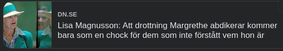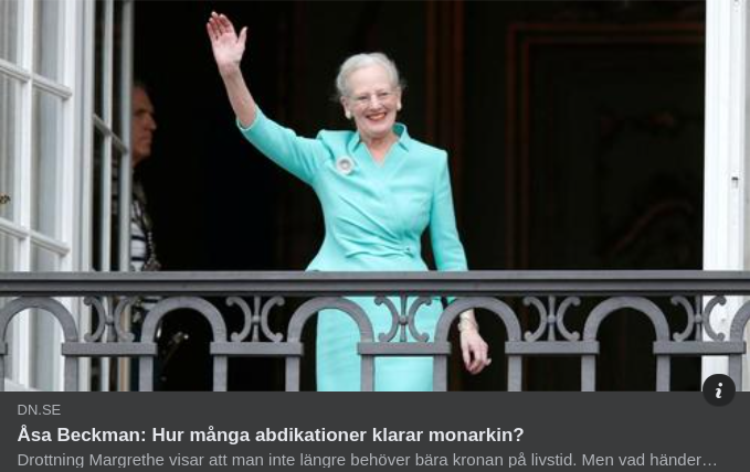"Precis när nyårsbubblet var upphällt kom skrällen: den danska drottningen abdikerar. Efter 52 år på tronen väljer Margrethe att låta kronprins Frederik ta över. Den 83-åriga drottningen går med käpp och efter en ryggoperation förra vintern har hon känt att det är dags att lämna över till nästa generation.