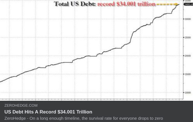 Det amerikanska finansdepartementet har en sjuklig vana att avslöja stora, runda skulder runt stora kalendermilstolpar, och det nya året 2024 var inte annorlunda eftersom det enligt det senaste Treasury Daily Statement som publicerades efter stängningen idag och som återspeglar det amerikanska finansdepartementets finansiella rapporter per Den 29 december 2023 var USA:s totala skuld vid årets slut - drumroll - drygt 34 biljoner dollar för första gången någonsin, eller 34 001 493 655 565,48 dollar för att vara exakt.
