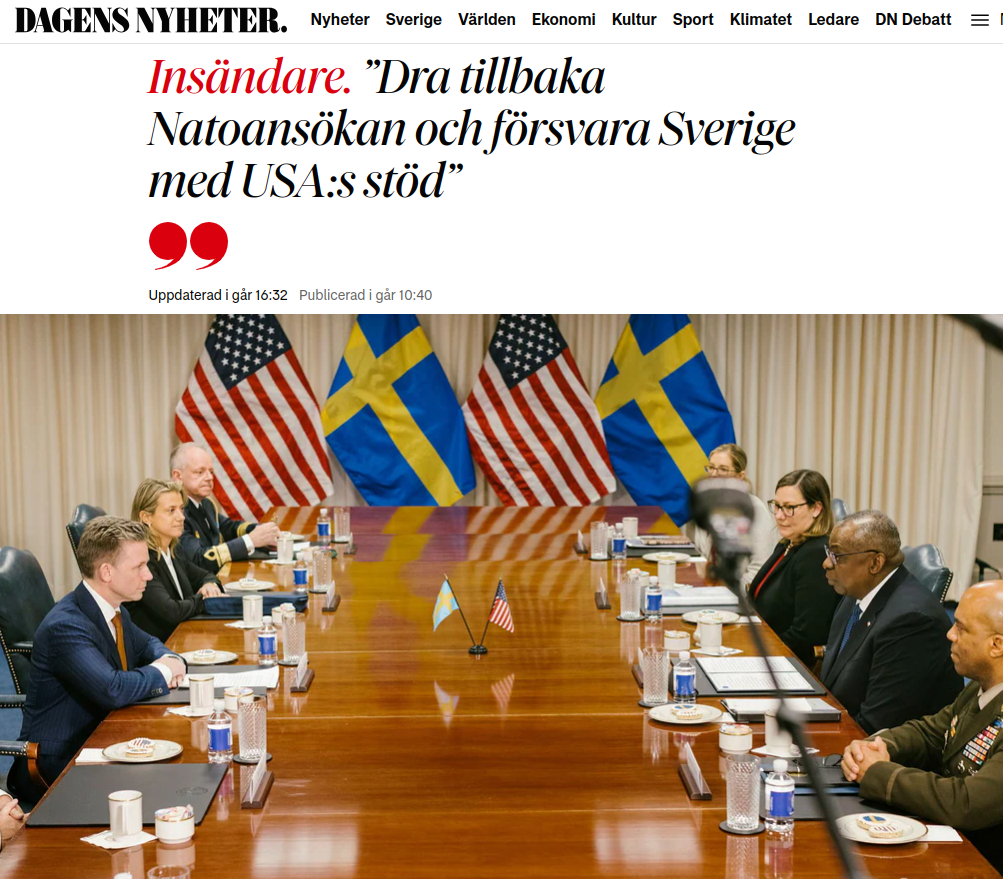 "Insändare. ”Dra tillbaka Natoansökan och försvara Sverige med USA:s stöd