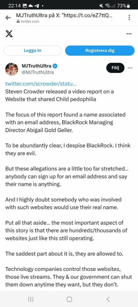Steven Crowder released a video report on a Website that shared Child pedophilia The focus of this report found a name associated with an email address, BlackRock Managing Director Abigail Gold Geller. To be abundantly clear, I despise BlackRock. I think they are evil. But these allegations are a little too far stretched… anybody can sign up for an email address and say their name is anything. And I highly doubt somebody who was involved with such websites would use their real name. Put all that aside… the most important aspect of this story is that there are hundreds/thousands of websites just like this still operating. The saddest part about it is, they are allowed to. Technology companies control those websites, those live streams. They & our government can shut them down anytime they want, but they don’t. Companies like Ericsson & other Big Tech companies have connected all these sick & evil people to do business. That is the real underlying story… The BlackRock connection is a dud..