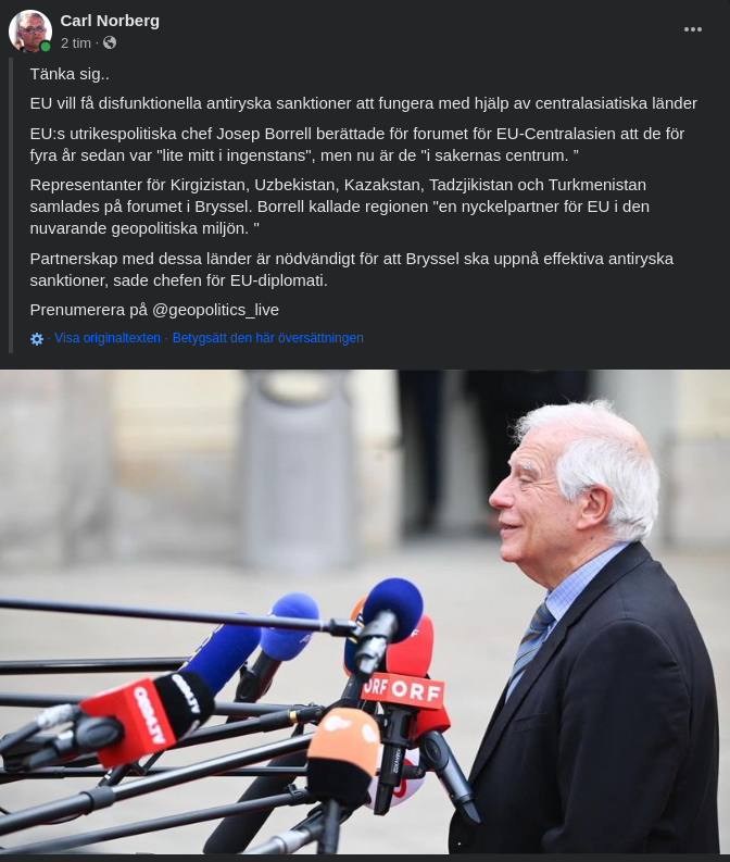 Tänka sig.. The EU wants to make disfunctional anti-Russian sanctions work with the help of Central Asian countries EU foreign policy chief Josep Borrell told the EU-Central Asia forum that four years ago they were “a little in the middle of nowhere,” but now they are “in the center of things.” Representatives of Kyrgyzstan, Uzbekistan, Kazakhstan, Tajikistan and Turkmenistan gathered at the forum in Brussels. Borrell called the region "a key partner for the EU in the current geopolitical environment." Partnership with these countries is necessary for Brussels to achieve the effectiveness of anti-Russian sanctions, the head of EU diplomacy said. Subscribe to @geopolitics_live Tänka sig.. EU vill få disfunktionella antiryska sanktioner att fungera med hjälp av centralasiatiska länder EU:s utrikespolitiska chef Josep Borrell berättade för forumet för EU-Centralasien att de för fyra år sedan var "lite mitt i ingenstans", men nu är de "i sakernas centrum. ” Representanter för Kirgizistan, Uzbekistan, Kazakstan, Tadzjikistan och Turkmenistan samlades på forumet i Bryssel. Borrell kallade regionen "en nyckelpartner för EU i den nuvarande geopolitiska miljön. " Partnerskap med dessa länder är nödvändigt för att Bryssel ska uppnå effektiva antiryska sanktioner, sade chefen för EU-diplomati. Prenumerera på @geopolitics_live