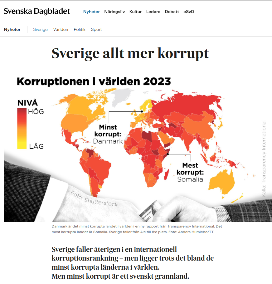 Antisametismens vågor går höga.. https://www.svd.se/a/eJ3A4g/sametinget-och-hakan-jonssons-svar-ar-inte-seriost "Att medborgarna ska ha insyn i den offentliga maktutövningen är en bärande princip i den svenska demokratin. Att åstadkomma sådan insyn är också en av journalistikens viktigaste funktioner. Det är bland annat därför Sverige har en långtgående offentlighetsprincip, och att makthavarnas grundhållning bör vara att inte motarbeta eller i onödan kritisera mediernas arbete. Att en statlig myndighet pekar ut en dagstidning som brottslig är därför synnerligen allvarligt. Men det är just vad Sametingets styrelseordförande Håkan Jonsson gjorde den gångna helgen. I ett debattinlägg i Expressen (27/1) hävdar han att SvD Ledares artikelserie om grava oegentligheter på myndigheten Sametinget är en ”attack” inte bara mot samerna som folk, utan mot hela den svenska demokratin. SvD:s rapportering, skriver Jonsson, spär på rasism och innehåller ”uttalanden som vi bedömer som hets mot folkgrupp”. Han ger inga exempel på sådana uttalanden. Skälet är enkelt: det finns inga. Det finns bara tre noggrant underbyggda artiklar, baserade på bland annat vittnesmål från personal på Håkan Jonssons eget kansli, om en statlig myndighet som gravt missköter sina uppgifter, missbrukar sin ställning och vars politiska ledning anser sig stå över svensk lag. En kritik som Jonsson erbjöds att bemöta i SvD – men som han i stället först besvarade med tystnad, och därefter med ett substanslöst inlägg i en annan tidning. Faktum är att SvD:s artikelserie hade kunnat få ytterligare delar. Sedan publiceringarna har det strömmat in tips om ytterligare oegentligheter på Sametinget, även från den samiska befolkning som Jonsson hävdar att SvD försöker ”misstänkliggöra”. Och så sent som i fredags gick ett samiskt oppositionsparti till förvaltningsrätten, för att laglighetspröva Sametingsstyrelsens senaste försök att tillskansa sig mer makt och resurser. Styrelsen försöker ta över ansvaret för (statligt finansierade) miljonbidrag till samiska organisationer, vilket enligt kritikerna strider mot den arbetsordning Sametinget måste följa. Att ledningen för en myndighet bemöter saklig och välgrundad kritik med osakliga påhopp är ytterligare en illustration av att Sametinget inte förmår att hantera det ansvar och de befogenheter det getts av staten. Och en illustration av att regeringen så snart som möjligt måste ta dem därifrån."https://www.svd.se/a/Llw88P/sverige-allt-mer-korrupt Organisationen Transparency International gör varje år en bedömning av hur lite eller mycket korrupta världens länder är. I år hamnar Sverige på plats 6 av 180 med 82 av max 100 poäng. Det är en poäng lägre än förra året och den sämsta placeringen sedan mätningarna startade. Poängen bygger på hur experter och affärspersoner upplever landets offentliga sektor, när det kommer till korruption. I topp på listan över de minst korrupta länderna ligger för sjätte året i rad Danmark, följt av Finland, Nya Zeeland och Norge. I botten på listan finns icke-demokratiska länder som Somalia, Venezuela, Syrien, Sydsudan och Nordkorea. Inget land når full pott och medelvärdet hamnar på 43. Att över hälften av länderna hamnar på poäng lägre än medel är allvarligt, enligt Transparency International. I rapporten lyfts också det faktum att EU-länderna i snitt har tappat poäng de senaste åren. Samtidigt har initiativet för att begränsa korruption avstannat i många länder i Västeuropa.