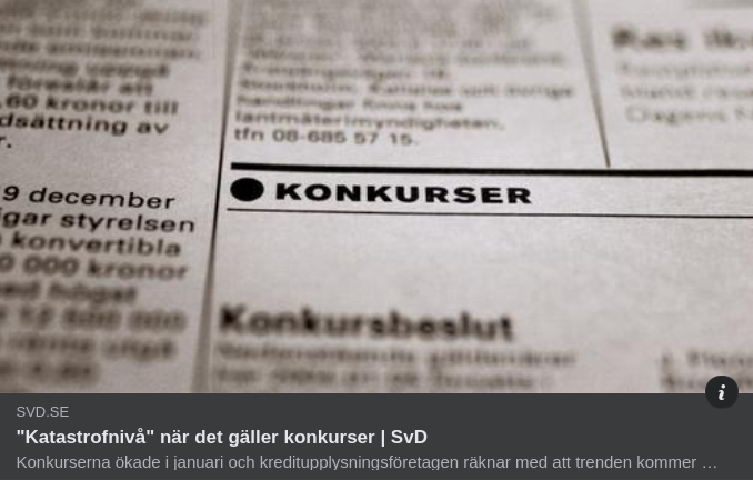 https://www.svd.se/a/BWgjng/katastrofniva-nar-det-galler-konkurser Konkurserna ökade i januari och kreditupplysningsföretagen räknar med att trenden kommer hålla i sig under 2024. Många bolag särskilt i restaurangbranschen kämpar för sin överlevnad. "Katastrofnivå" när det gäller konkurser Antalet konkurser steg under januari med 45 procent jämfört med samma period 2023 enligt månadsstatistik från UC. ”Konkurserna har nått nya katastrofala nivåer, inom vissa branscher är ökningen över hundra procent, i jämförelse med de redan höga konkurstalen i fjol”, skriver UC i en kommentar. Den största ökningen, 170 procent, har skett inom vård och omsorg, därefter kommer hotell och restaurang med en uppgång på 113 procent. I en prognos räknar UC med att 16 000 bolag riskerar att gå i konkurs under 2024 där flest bolag som löper hög risk att drabbas finns inom byggsektorn (13 procent) och därefter restaurangverksamhet (9 procent). Även kreditupplysningsföretaget Syna har noterat utvecklingen. Bolagets vd Karl Stjerna pekar särskilt ut bygg- och fastighetsbranschen och restaurangbranschen som problemtyngd. ”Inom restaurangbranschen är det många som kämpar för sin överlevnad när hushållen håller allt hårdare i plånboken”, säger han i en kommentar. Både Syna och kredithanteringsföretaget Creditsafe anger antalet konkurser i januari till drygt 1 040. Creditsafe uppger att detta är det högsta antalet sedan mätningarna började 1999. ”Utvecklingen är tyvärr i linje med vår prognos, och det är otroligt dystra siffror”, säger Creditsafes vd Henrik Jacobsson i en kommentar. Även Karl Stjerna räknar med att antalet konkurser fortsatt kommer att ligga högt under året, och att små och medelstora företag är särskilt drabbade. ”Många företag har försökt hålla ut, men i takt med ett sinande kassaflöde och krympande orderböcker står man inför faktum: att det inte går att driva verksamheten vidare”.