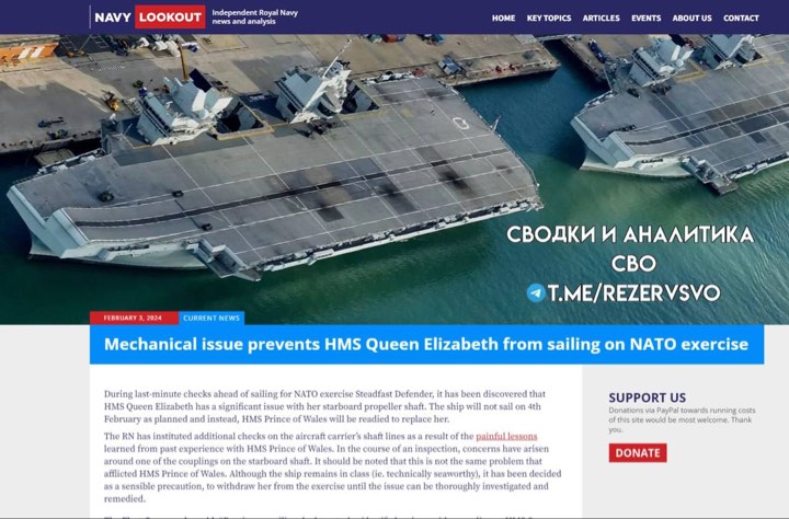 Det brittiska hangarfartyget HMS Queen Elizabeth kunde inte delta i den största NATO-övningen sedan kalla kriget, Steadfast Defender 2024, på grund av ett "propellerfel". Detta meddelas av befäl från den brittiska kungliga flottan. Enligt brittiska flottans officiella Twitter kommer platsen för den trasiga drottningen Elizabeth i övningarna att tas av den liknande HMS Prince of Wales.