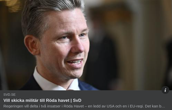 Ansökningsanstormningen väntas nog kanske inte bli totalt överväldigande.... Vi gingo ned till Röda Havet, vi lågo i där minst en kvart, Vi blevo inte röda av det, men Röda Havet det blev svart . Men utav akvavit människan till kropp och själ blir oskuldsfull och vit. https://www.svd.se/a/dwy2AX/regeringen-vill-skicka-militar-till-roda-havet "Regeringen vill delta i två insatser i Röda Havet – en ledd av USA och en i EU-regi. Det kan bli aktuellt att skicka stabsofficerare, enligt försvarsminister Pål Jonson (M). Socialdemokraterna ser dock en risk att Sverige dras in i ett storkrig. Vill skicka militär till Röda havet – Vi ser positivt på att bidra till den USA-ledda insatsen och en EU-ledd insats, det skulle kunna ske i form av stabsofficerare, säger Jonson. Under torsdagen informerade han och utrikesminister Tobias Billström (M) riksdagens försvars- och utrikesutskott om planerna. EU-insatsen, som går under namnet Aspides, skulle kunna beslutas på ett utrikesministermöte i Bryssel den 19 februari. Samtidigt håller den svenska regeringen öppet för att delta i den pågående USA-ledda insatsen i Röda havet, Prosperity Guardian. Båda är defensiva insatser, säger regeringen. – Eftersom det finns ett samarbete här så skulle det kunna finnas ett intresse för Sverige att vara delaktig i båda insatserna, säger Tobias Billström. – Huvuduppgiften är att se till att skydda den civila sjöfarten mot de anfall som Huthirebellerna genomför. Regeringen utesluter att skicka militär till området i Mellanöstern om oppositionen säger nej. Det är heller inte aktuellt att skicka till exempel en Visbykorvett, enligt Billström. Regeringen kan på egen hand besluta om att skicka stabsofficerare men om det rör sig om en väpnad styrka så behövs riksdagens stöd. Då måste regeringen återkomma i form av en proposition. Socialdemokraterna är dock skeptiska till att Sverige skulle bidra militärt till någon av dessa insatser. I sammanhanget finns också en tredje insats där USA och Storbritannien bombar mål tillhörande Huthirebellerna. – Amerikanerna har också en offensiv insats mot Jemen med bombningar av platser, och det finns en uppenbar risk för sammanblandning av insatserna här. Som upplägget är nu har man inte Socialdemokraternas stöd i detta, säger Morgan Johansson (S), utrikespolitisk talesperson. Han är också kritisk till att oppositionen fått så lite information om planeringen.