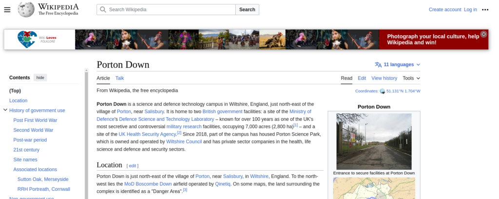 Porton Down är ett vetenskaps- och försvarsteknologicampus i Wiltshire, England, strax nordost om byn Porton , nära Salisbury . Det är hem för två brittiska statliga anläggningar: en plats för försvarsministeriets försvarsvetenskap och teknologilaboratorium – känd i över 100 år som en av Storbritanniens mest hemlighetsfulla och kontroversiella militära forskningsanläggningar , som upptar 2 800 hektar [ 1] – och en webbplats för UK Health Security Agency . [2] Sedan 2018 har en del av campus inrymt Porton Science Park, som ägs och drivs av Wiltshire Council och har privata företag inom hälso-, life science- och försvars- och säkerhetssektorerna. Plats Porton Down ligger strax nordost om byn Porton , nära Salisbury , i Wiltshire , England. I nordväst ligger MoD Boscombe Down- flygfältet som drivs av Qinetiq . På vissa kartor är marken som omger komplexet identifierad som ett "farligt område". [3] Historik om statlig användning Det här avsnittet behöver ytterligare hänvisningar för verifiering . Hjälp till att förbättra den här artikeln genom att lägga till citat till pålitliga källor i det här avsnittet. Material utan källa kan ifrågasättas och tas bort. ( juni 2013 ) ( Lär dig hur och när du tar bort detta mallmeddelande ) 2-tums mortelförsök , 1917 Porton Down öppnade 1916 som War Department Experimental Station , kort därefter omdöpt till Royal Engineers Experimental Station , för att testa kemiska vapen som svar på tysk användning av detta krigsmedel 1915. Laboratoriets uppdrag var att bedriva forskning och utveckling avseende kemiska vapen medel som användes av de brittiska väpnade styrkorna under första världskriget, såsom klor , senapsgas och fosgen . [4] Arbetet på Porton startade i mars 1916. Vid den tiden var endast ett fåtal stugor och gårdsbyggnader utspridda på nedgångarna vid Porton och Idmiston . I maj 1917 hade fokus för anti-gasförsvar och utveckling av respiratorer flyttats från London till Porton Down, och 1918 hade de ursprungliga två hydorna blivit ett stort hyttläger med 50 officerare och 1 100 andra grader. Efter vapenstilleståndet 1918 reducerades Porton Down till en skelettstav. [5] Efter första världskriget 1919 inrättade krigskontoret Holland-kommittén för att överväga framtiden för kemisk krigföring och försvar. År 1920 gick regeringen med på kommitténs rekommendation att arbetet skulle fortsätta vid Porton Down. Från det datumet började ett långsamt permanent byggnadsprogram, tillsammans med den gradvisa rekryteringen av civila forskare. År 1922 fanns det 380 militärer, 23 vetenskapliga och tekniska tjänstemän och 25 "civila underordnade". 1923 startade det nybildade Silver Star Motor Services en busslinje för att länka Salisbury och Porton Down. [6] År 1925 hade den civila personalen fördubblats. [5] År 1926 lades de kemiska försvarsaspekterna av Air Raid Precautions (ARP) för civilbefolkningen till stationens ansvar. 1929 blev Royal Engineers Experimental Station till Chemical Warfare Experimental Station ( CWES ) (1929–1930), och 1930 Chemical Defense Experimental Station ( CDES ) (1930–1948). [5] År 1930 ratificerade Storbritannien 1925 års Genèveprotokoll med reservationer, som endast tillät användning av kemiska krigföringsmedel som vedergällning. År 1938 var den internationella situationen sådan att regeringen godkände offensiv kemisk krigföring forskning och utveckling och produktion av krigsreservlager av kemiska krigföringsmedel av den kemiska industrin. [5] Detta inkluderade att genomföra kemisk krigföringsförsök , kända som Rawalpindi-experimenten , på militärer i den brittiska indiska armén för att testa effekterna av senapsgas . [7] Andra världskriget Under andra världskriget koncentrerades forskningen vid CDES på kemiska vapen som kvävesenap . När allierade arméer trängde in i Tyskland, upptäckte de operativa lager av ammunition och vapen som innehöll nya kemiska krigföringsmedel, inklusive mycket giftiga organofosforhaltiga nervämnen som sarin , okända för Storbritannien och de allierade vid den tiden. [5] För att undersöka biologiska vapen etablerades en mycket hemlig separat avdelning, kallad Biology Department, Porton ( BDP ), inom CDES 1940, under veteranmikrobiologen Paul Fildes . Dess fokus inkluderade mjältbrand och botulinumtoxin , och 1942 genomförde den ökänt tester av ett biovapen av mjältbrand på Gruinard Island . 1946 döptes det om till Microbiological Research Department ( MRD ) och 1957 till Microbiological Research Establishment ( MRE ). Common Cold Unit (CCU) förväxlades ibland med MRE, som den ibland samarbetade med men inte var officiellt kopplad. CCU var på Harvard Hospital, Harnham Down, på västra sidan av Salisbury . [5] Efterkrigstiden När andra världskriget slutade hade det avancerade tillståndet för tysk teknologi när det gäller organofosforiska nervämnen, såsom tabun , sarin och soman , överraskat de allierade, som var ivriga att dra nytta av det. Efterföljande forskning tog de nyupptäckta tyska nervgiftarna som utgångspunkt, och så småningom utvecklades VX nervgift vid Porton Down 1952. [5] I slutet av 1940-talet och början av 1950-talet syftade forskning och utveckling vid Porton Down till att förse Storbritannien med medel att beväpna sig med en modern nervgiftsbaserad förmåga och att utveckla specifika försvarsmedel mot dessa medel. I slutändan blev dessa mål ingenting på den offensiva sidan på grund av beslutet att överge någon form av brittisk kapacitet för kemisk krigföring till förmån för kärnvapen. På den defensiva sidan fanns det år av svårt arbete för att utveckla metoder för profylax, terapi, snabb upptäckt och identifiering, dekontaminering och effektivare skydd av kroppen mot nervämnen, som kan utöva effekter genom huden, ögonen och luftvägarna . [5] Tester utfördes på militärer för att fastställa effekterna a