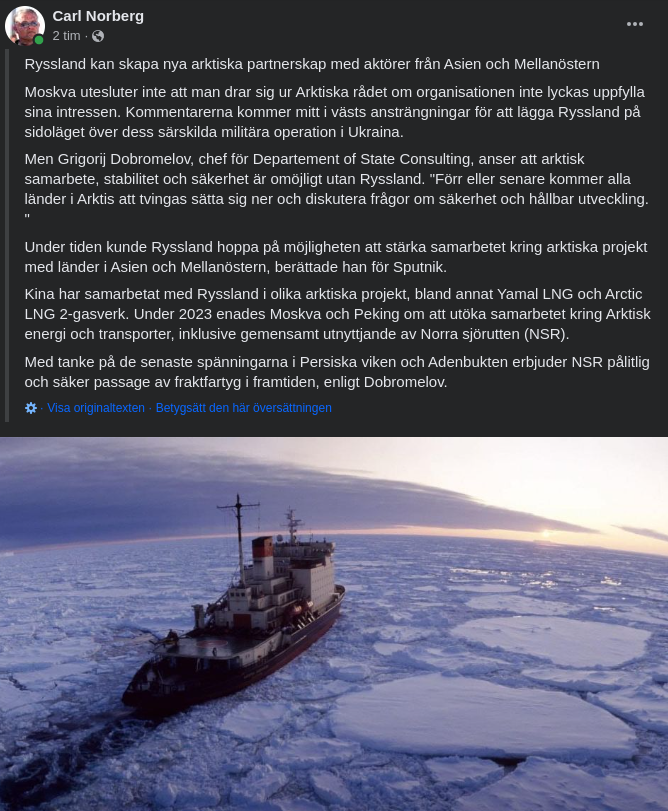 Ryssland kan skapa nya arktiska partnerskap med aktörer från Asien och Mellanöstern Moskva utesluter inte att man drar sig ur Arktiska rådet om organisationen inte lyckas uppfylla sina intressen. Kommentarerna kommer mitt i västs ansträngningar för att lägga Ryssland på sidoläget över dess särskilda militära operation i Ukraina. Men Grigorij Dobromelov, chef för Departement of State Consulting, anser att arktisk samarbete, stabilitet och säkerhet är omöjligt utan Ryssland. "Förr eller senare kommer alla länder i Arktis att tvingas sätta sig ner och diskutera frågor om säkerhet och hållbar utveckling. " Under tiden kunde Ryssland hoppa på möjligheten att stärka samarbetet kring arktiska projekt med länder i Asien och Mellanöstern, berättade han för Sputnik. Kina har samarbetat med Ryssland i olika arktiska projekt, bland annat Yamal LNG och Arctic LNG 2-gasverk. Under 2023 enades Moskva och Peking om att utöka samarbetet kring Arktisk energi och transporter, inklusive gemensamt utnyttjande av Norra sjörutten (NSR). Med tanke på de senaste spänningarna i Persiska viken och Adenbukten erbjuder NSR pålitlig och säker passage av fraktfartyg i framtiden, enligt Dobromelov.