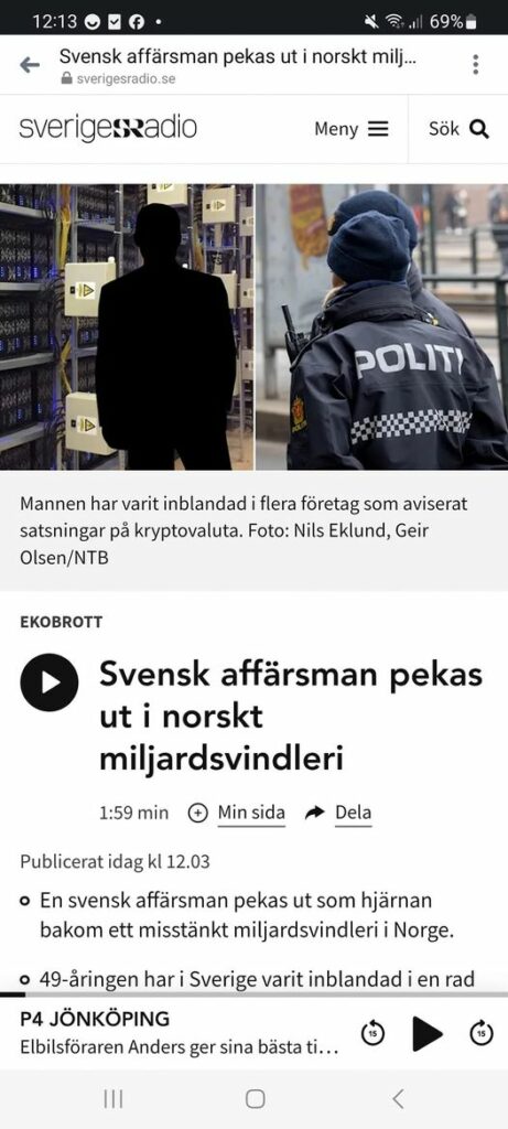 Stackars De som blir allt fler.. https://sverigesradio.se/artikel/svensk-affarsman-pekas-ut-i-norskt-miljardsvindleri "En svensk affärsman pekas ut som hjärnan bakom ett misstänkt miljardsvindleri i Norge. 49-åringen har i Sverige varit inblandad i en rad turbulenta affärer, bland annat kring nedlagda glasbruk i Småland, och han sitter sedan i höstas häktad för grova ekobrott. Själv har han återkommande tillbakavisat alla anklagelser om oegentligheter och brott. Den 49-årige affärsmannen har i Sverige under lång tid agerat i en rad företag som omgärdats av kritik och anklagelser om bluff och bedrägerier, framför allt kring satsningar som rört kryptovalutor och fastigheter. Ekot och P4 Kalmar har tidigare berättat hur han varit aktiv i härvan kring nedlagda glasbruk i Småland, där det också funnits flera kopplingar till knarkaffärer inklusive till en person i det kriminella nätverket Foxtrot, ett avslöjande som i höstas väckte starka reaktioner. Nu visar en granskning i den norska affärstidningen Finansavisens magasin Kapital att mannen också spelat en central roll i ett misstänkt miljardsvindleri, där påstådda miljardvärden ska ha pumpats upp kring ett energibolag och planerad oljeutvinning. Svensk rånare Han ska ha varit aktiv i flera olika roller i härvan där stora summor försvunnit och det finns flera misstankar om oegentligheter. Affärsmannen är inte ensam svensk att uppmärksammas i granskningen – bland annat nämns en person som dömts för ett mycket uppmärksammat rån i Sverige – men affärsmannen beskrivs som den centrala aktören. Granskningen är den andra på kort tid som uppmärksammat 49-åringens affärer i Norge. Knarkkartell I december visade tidningen Dagbladet i en granskning av en omfattande penningtvättshärva, hur en av mannens affärspartners haft samröre med företrädare för en av världens mest kända knarkkarteller. Ekot har genom egna källor fått en stor del av uppgifterna bekräftade, och vår granskning visar också att ytterligare svenska affärsmän har varit aktiva i de norska härvorna. Vi har utan resultat sökt affärsmannen via hans advokat. Han har tidigare i olika sammanhang tillbakavisat alla anklagelser om oegentligheter och brott."