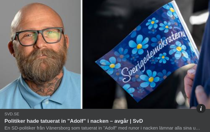 Här måste vi nog tala med en absolut expert i saken.... https://www.svd.se/a/MoOy3E/sd-politiker-i-vanersborg-som-tatuerat-in-adolf-i-nacken-avgar "En SD-politiker från Vänersborg som tatuerat in ”Adolf” med runor i nacken lämnar alla sina uppdrag. Själv påstår han sig vara ovetande om vad runorna betyder. ”Jag ska prata med min tatuerare”, säger politikern till TTELA. Politiker hade tatuerat in ”Adolf” i nacken – avgår Kommunfullmäktigeledamoten Jimmy Lindqvist har många tatueringar. Men motiven i nacken och på bakhuvudet sticker ut. Där återfinns symbolen ”Vägvisaren” ackompanjerad av ”Adolf” skrivet i runskrift. Det har inte fallit i god jord hos den lokala SD-ledningen. Jimmy Lindqvist kommer nu att lämna både partiet och samtliga uppdrag. Kombinationen med symbolen, som är populär i högerextrema kretsar, och namnet Adolf, pekar i en mycket tydlig riktning, enligt Jonathan Leman, researcher på den antirasistiska stiftelsen Expo. – Det är omöjligt att tänka sig att det inte ska uppfattas som en hyllning till Adolf Hitler, säger han till lokaltidningen TTELA. Jimmy Lindqvist (SD) lämnar Jimmy Lindqvist (SD) lämnar Foto: Skärmbild från X Trots att Lindqvist fattat beslutet att avgå hävdar politikern att han ”bara tog någon runskrift och tatuerade in” och inte vet vad runorna betyder. När TTELA konfronterar honom verkar han förvånad. – Står det Adolf? Det tror jag ändå inte att det gör. Han hävdar bestämt att det inte rör sig om en hommage till Hitler. – Det skulle nästan kännas som ett påhopp att associera detta som en hyllning till Adolf Hitler. Runor har med vikingar att göra, inte med nazism. Drivkraften ska i stället varit en fäbless för vikingamönster. När runskriftens betydelse nu retts ut kan åtgärder komma att vidtas. – Jag ska prata med min tatuerare, säger Lindqvist till TTELA.