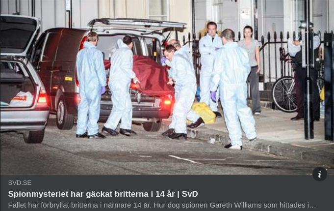 Det låter inte riktigt som hela bilden.... För det var väl aldrig som så att vederbörande hade blivit rekryterad... "Fallet har förbryllat britterna i närmare 14 år. Hur dog spionen Gareth Williams som hittades inlåst i en väska i sitt badrum? Nu uppger polisen att fallet är löst. https://www.svd.se/a/GMpArB/gareth-williams-hittades-dod-i-vaska-nu-har-polisen-lost-fallet Spionmysteriet har gäckat britterna i 14 år LONDON Den 23 augusti 2010 bryter sig Londonpolisen in en av underrättelsetjänsten MI6 tjänstebostäder i Pimlico i London. Den 31-åriga Gareth Williams har inte dykt upp på jobbet på spionbyrån på flera dagar och hans familj får inte tag på honom. I lägenhetens badrum hittar polisen en röd väska i badkaret. Från dragkedjan hänger ett lås. Inne i väskan ligger Gareth Williams. Han är naken och har varit död i flera dagar. Bredvid honom i väskan ligger nycklarna till låset. Fallet verkar som taget ur en kriminalroman och har fängslat britterna i 14 år. Den första utredningen slog 2012 fast att en utomstående person hade orsakat Gareth Williams död. Bland annat hittades inte Williams egna fingeravtryck på utsidan av väskan eller på låset. I samband med utredningen försökte också två experter låsa in sig i samma sorts väska – en gymväska som var 82 cm lång och 48 cm bred. De uppges ha gjort 400 försök men lyckades inte. Men varken dna eller spår av någon utomstående har hittats av polisen i lägenheten. Dessutom uppdagades det att Gareth Williams ett par år tidigare ropat på hjälp. Hade låst in sig själv i väskan Hans hyresvärd hade då kommit till undsättning och hittat honom fastkedjad i sängen. Enligt hyresvärden hade Williams berättat att han experimenterat med om han kunde lösgöra sig. Polisen har också offentliggjort att Williams ibland sökt efter bondagematerial på nätet. Och nu uppger polisen att fallet är löst. Londons kriminalpolis Scotland Yard har under de senaste två åren gått igenom materialet från brottsplatsen med modern dna-teknik. Under utredningen har varken nytt dna-material eller spår av en annan person i lägenheten uppdagats. Därför anser polisen nu att Gareth Williams dog efter att han låst in sig själv i väskan. Enligt experter skulle Williams ha förlorat medvetandet på grund av koldioxidförgiftning efter bara ett par minuter i väskan. Gareth Williams hade jobbat för den brittiska underrättelsetjänsten i närmare nio år då han dog, men få av hans kollegor visste särskilt mycket om honom, enligt uppgifter i brittiska medier. Matematiker och topphemlig avlyssning Han beskrivs som en kodknäckare och ett matematikgeni och uppgavs ha varit en man som höll sig för sig själv. Han hade varit borta från jobbet i fem dagar innan kollegorna rapporterade hans frånvaro, trots att han arbetade i ett litet team med bara tre andra personer, enligt medier. Han uppges bland annat ha arbetat med topphemlig avlyssning av utländska ambassader då han dog. Fallet har fått stor uppmärksamhet i Storbritannien i flera år, men för Gareth Williams familj är det en tragedi som fortfarande uppges väcka frågor. Familjen har tidigare uttalat sig om att utredningen tappat bort bevismaterial, eller att bevismaterial förstörts. Påstods ha mördats av ryska agenter Fem år efter den första dödsutredningen uppgav en före detta KGB-agent som deserterat till Storbritannien att Gareth Williams mördats av ryska spioner. Orsaken var enligt honom att den ryska underrättelsetjänsten försökt rekrytera Williams, men att han vägrat. På grund av försöket skulle han ha kunnat peka ut en dubbelagent inom den brittiska underrättelsetjänsten. Det är ett påstående som nu tillbakavisas av Scotland Yard. Enligt polisen finns det inte belägg för att Gareth Williams skulle ha mördats."