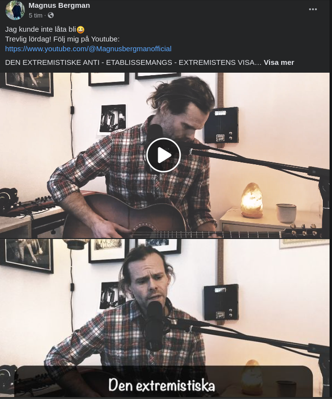 Jag kunde inte låta bli Trevlig lördag! Följ mig på Youtube: https://www.youtube.com/@Magnusbergmanofficial DEN EXTREMISTISKE ANTI - ETABLISSEMANGS - EXTREMISTENS VISA ------------------------------------------------- Den extremistiska extremisten Vem kan det va? Det är lätt att skjuta pianisten Någon som bara undrar, som du och jag En anti-etablissemangs-extremist Ja, så heter nu det visst Men vad sägs om lite ordinärt sans och vett? Att tänka fritt och inte rätt Att till ett ord lägga till ändelsen -ism Är att ladda pennan distinkt För här uppstår alltid en twist i schism Och den twisten kan användas flinkt Och peka finger åt en anti-etablissemangs-extremist Är nog inte till fullo av list För att använda ett ord utan sans och vett Är inte att tänka fritt utan rätt Så nationalism eller konservatism Socialism eller vad sägs om snobbism? Egoism eller humanism Mysticism eller naivism Alla dessa ismer, taget från samma skaft Allt för att kontrollera tankens kraft För att inte använda sans och vett Du ska inte tänka fritt utan rätt Så jag glädjer mig åt din intuition Du kära Anti-etablissemangs-extremist Vad är verkligt och vad är fiktion? Vem är en verkligt aktiv aktivist? Den som agerar i ledband Åt en lömsk och listig hand? Eller den som använder sitt sans och vett Och tänker fritt och vägrar tänka rätt