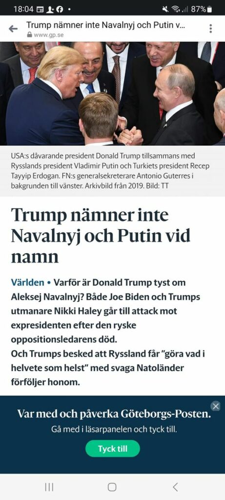 Britt-Marie Mattsson Uppdaterad för 4 minuter sedan|Publicerad idag 17:58 Joe Biden och ledare i övriga västvärlden fördömer i hårda ordalag Vladimir Putin som ansvarig för den fängslade ryske oppositionsledaren Aleksej Navalnyjs död i ett fångläger. Men Donald Trump har varken nämnt Putin eller Navalnyj vid namn. Han anklagar istället Joe Biden för att vara svag och för att inte förstå sig på världen. Trump hävdar att han den ende som kan garantera fred, framtidstro och stabilitet. Trumplojala republikanska senatorer och kongressledamöter är inne på samma linje och försöker undvika att kommentera Navalnyj och Putins ansvar för hans död. Senatorn Tim Scott – som har ambitionen att bli Trumps vicepresidentkandidat – tillhör de som framför talepunkterna om att den förre presidenten är garanten för en lugn och fredlig värld. Joe Biden och Nikki Haley går i det här avseendet hand i hand Men Nikki Haley – som är den enda återstående konkurrenten till Trump om den republikanska nomineringen – hamrar in att det är precis tvärtom. Och hon tar vid varje valmöte upp att Trump häromdagen gav Ryssland och Putin fritt fram att ”göra vad i helvete som helst” med Nato-länder som inte förmår att avsätta stipulerade två procent av sina BNP till försvarsutgifter. Joe Biden och Nikki Haley går i det här avseendet hand i hand och det gäller även Putins ansvar för Aleksej Navalnyjs död. Republikanerna i representanthuset har hamnat i en komplicerad situation eftersom talmannen Mike Johnson gått i Donald Trumps ledband och förhalat en omröstning om ytterligare bistånd till Ukraina kopplat till en politisk kompromiss om gränsbevakningen mot Mexiko. Nu har kongressen tagit två veckors ledighet och kan därför inte ta upp frågan. Blommor och en bild på Aleksej Navalnyj utanför det ryska konsulatet i Frankfurt på lördagen. Blommor och en bild på Aleksej Navalnyj utanför det ryska konsulatet i Frankfurt på lördagen. Bild: Michael Probst Joe Biden och demokraterna anklagar republikanerna för att ha bidragit till Ukrainas svåra situation, något som även president Volodomyr Zelenskyj instämt i när han konstaterat att diktatorer tar inte semester. Hela det politiska spelet i Washington hänger samman med att Donald Trump påverkat republikanerna i kongressen att inte rösta igenom något som skulle kunna gynna Joe Biden i valrörelsen. Ett av Trumps trumfkort är att han skall klara av gränskrisen och dessutom avsluta kriget i Ukraina på tjugofyra timmar efter att ha ”talat förstånd” med Vladimir Putin. Republikanerna röstar därför nej – eller tar inte upp – förslag som de själva tidigare drivit och nu senast ställt sig bakom. ”Trumps försök att hunsa Zelenskyj – som den doku-såpaskådis som han en gång varit – misslyckades till Trumps egen förvåning” För Trump är inte heller en helhjärtad uppställning för Ukraina enkel. I valrörelsen 2020 var just Ukraina en viktig del i hans kampanj och han anklagade sin motståndare Joe Biden för att ha hjälpt sonen Hunter att göra korrupta affärer i ett ukrainskt energibolag. Trump ringde upp president Volodomyr Zelenskyj och krävde att han skulle leta fram material som talade till Bidens nackdel och som kunde användas mot honom. Men Zelenskyj vägrade. Trump ställdes istället inför riksrätt för sitt agerande men frikändes av den republikanskt dominerande senaten. Trumps försök att hunsa Zelenskyj – som den doku-såpaskådis som han en gång varit – misslyckades till Trumps egen förvåning. I dag är Zelenskyj en folkhjälte som står upp mot Ryssland och Putin. USA har sedan kalla kriget omväxlande haft en djupfryst och upptinad relation till Sovjet/Ryssland. Men i grunden har det alltid funnits en påtaglig misstro mot regimen i Moskva. Med Donald Trump har allt vänts upp och ned. Trump talade under sin presidenttid uppskattande om Vladimir Putin. Nu har han svårt att säga det uppenbara, att Putin bär ansvaret för Aleksej Navalnyjs död."
