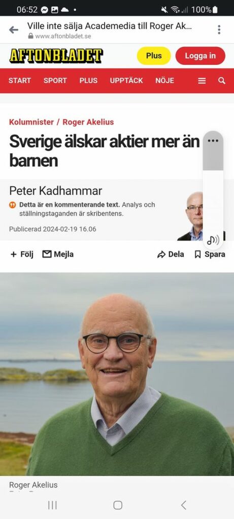 https://www.aftonbladet.se/nyheter/kolumnister/a/zEvVAv/ville-inte-salja-academedia-till-roger-akelius-aktiekursen-viktigast "I helgen kom den sensationella nyheten att investmentbolaget Mellby Gård häver försäljningen av skolkoncernen Academedia med 83 000 elever i 330 skolor i Sverige. Affären var undertecknad och klar men i fredags bad Mellby Gårds VD Johan Andersson ångerfullt att köpet skulle gå tillbaka. Ägarfamiljen Andersson hade sålt alla sina aktier i skolkoncernen till finansmannen Roger Akelius för 1,7 miljarder kronor. Han blev därmed största ägare med 25 procent av aktierna och i praktiken den som skulle bestämma över bolaget. Akelius sa i medierna att han ville satsa stort på skolan och slopa utdelningar till aktieägarna. Vinsten skulle investeras i skola och undervisning, inte betalas ut till privata ägare. Han är för övrigt emot aktieutdelningar i en verksamhet som finansieras med skattepengar. Dels blir det bara småpengar, säger han när jag talar med honom på telefon. Det räcker inte med att spara på administration och några kronor per skolmåltid för att det ska bli någon vinst att tala om. Man måste klämma ur (”squeeza”) skolan ännu mer för att det ska bli intressanta pengar för en kapitalist. Och det vill Akelius inte göra. Han sa dessutom att han tänkte skänka 100 000 lättlästa klassiker till eleverna, ”Anne Franks dagbok” till exempel, och Jack Londons underbara ”Skriet från vildmarken”. Akelius sa att han skulle satsa så att Sverige hamnar högt i den internationella Pisaundersökningen över kunskaper igen. Marknaden reagerade omedelbart. Värdet på aktierna tvärsjönk, minus 15 procent i onsdags. Och detta i ett land som hojtar om hur mycket vi älskar barnen! Ständigt tjatar politiker och företagare om hur mycket vi bryr oss om de små. Tidningarna publicerar rankningar som visar hur bra vi är. Ibland är vi det barnvänligaste landet på jorden, ibland det tredje, en gång halkade vi ner till tionde plats, det var hemskt. Hur kan vi vara så långt ner när vi är bäst? Strax kravlade vi oss upp igen. Malmö ska bli Sveriges barnvänligaste stad, har Malmö sagt. Norrlands kommuner tävlar om vilken som är barnvänligast. Västerbotten ska bli Sveriges barnvänligaste län, har Västerbotten sagt. De barnvänligaste stadsdelarna i Stockholm är analyserade och presenterade: Gröndal och Tegelhagen-Silverdal. Vi idisslar FN:s barnkonvention som säger att barnets bästa ska beaktas i alla beslut som berör barn. På Mellby Gårds hemsida kan man läsa: ”Alla barn har rätt till utbildning. Alla barn har rätt till att en tro på framtiden. Vi på Mellby Gård vill hjälpa till att förse utsatta barn med trygga, varma och utvecklande sammanhang”. Därför borde ägarfamiljen Andersson ha jublat när den nye ägaren Akelius ville använda vinstpengarna till barnens utbildning. Det borde ha varit särskilt glädjande eftersom det står på Academedias hemsida: ”Fokus för oss är att utveckla människor och målet är alltid att alla ska lyckas.” Bolagets ”vision” är enligt samma hemsida: ”Academedia ska leda utvecklingen av framtidens utbildning. För att lyckas med det arbetar vi ständigt för att utveckla våra verksamheter och hela tiden bli bättre.” Roger Akelius ville inte bara slopa aktieutdelningarna, han sa att de miljarder han redan tjänat ska gå till utbildning. Kan en ägare ha hedervärdare inställning – om vi nu ska ha privatägda skolor? Men Mellby Gårds VD Johan Andersson ringde till Roger Akelius i fredags och sa att han fått klagomål från aktieägare och Academedias ledning. – Johan kände det som om han hade lurat sina vänner. Han kände att hans heder försvann när han fick klagomål från aktieägarna, säger Akelius på telefon från Spanien. (Johan Andersson skickar ett sms till mig från ett flygplan över Atlanten. Han skriver att fick ”signaler från olika håll”, bland annat från ”vissa aktieägare”.) Roger Akelius hade gjort något som det barnälskande Friskolesverige aldrig hört talas om, något det barnälskande Sverige där våra härliga ungar alltid står i centrum inte brytt sig så särdeles mycket om. Den nye ägaren tänkte satsa på barnen! För vi älskar bara en sak mer än barnen. Aktiekursen."